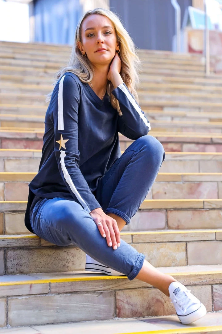 Add a touch of stripe to your wardrobe this season with a classic crew neck feature and graphics prints on the sleeve this Riley top has a drooped cozy fit. Style it with some slouchy jeans or track pant for a comfy seasonal look.Â