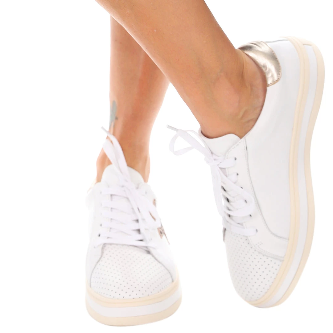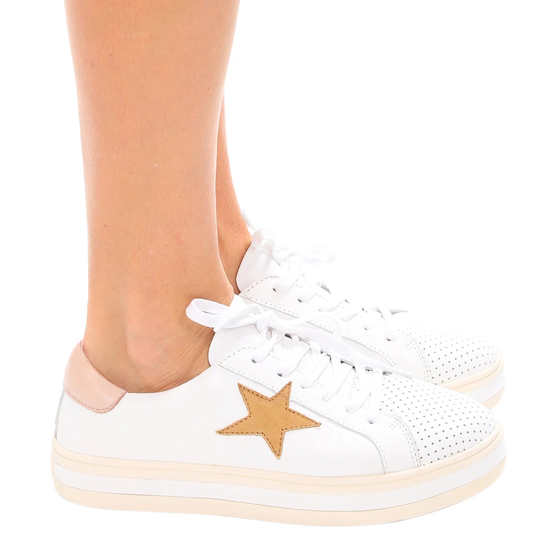 Pixie is a fashion-forward sneaker featuring a touch of leopard print, star detailing and a flatform sole (raised footbed), a nod to the current street style trends across Europe.