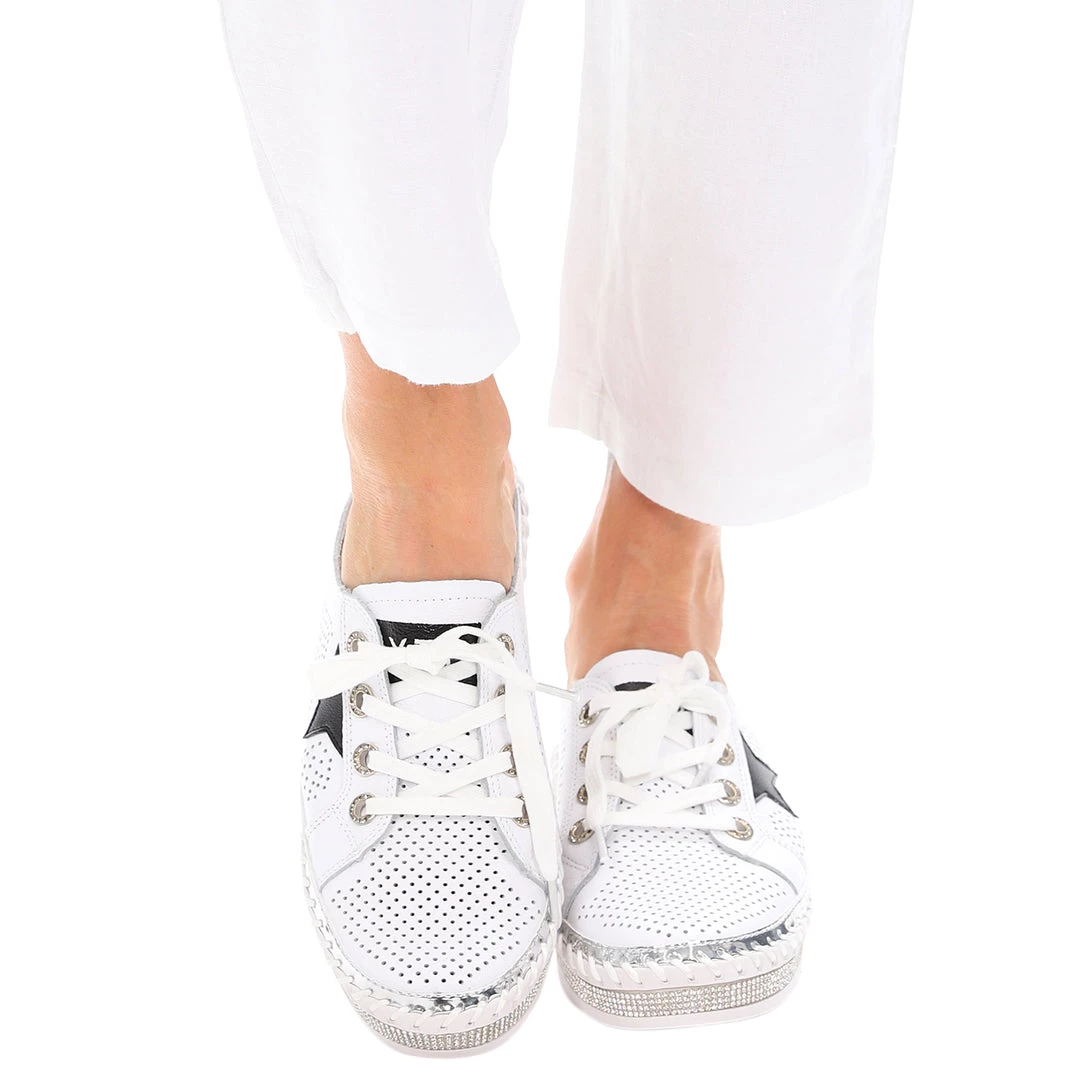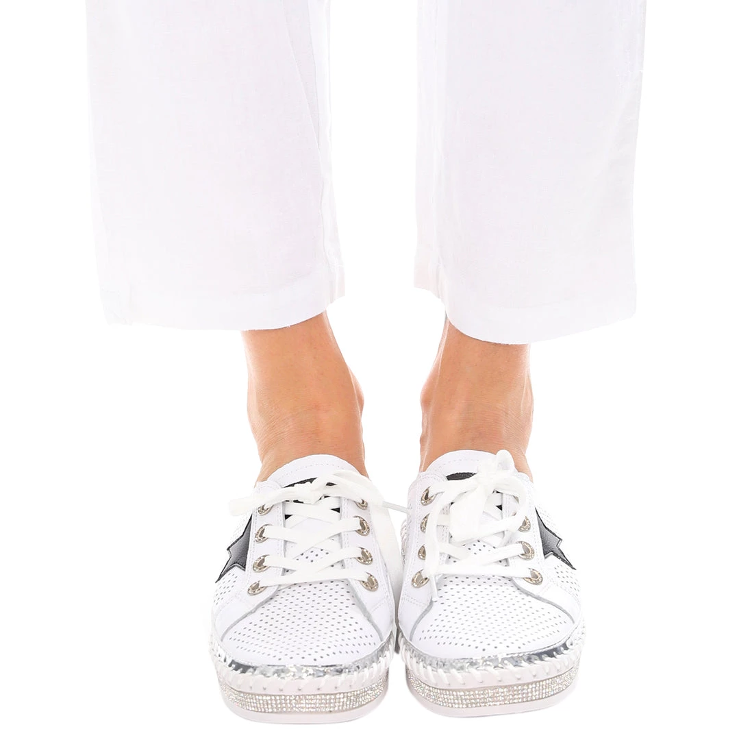Replace your standard sneakers with the Sadie Slide in White with a Black Star by Ameise! Brought to life with rhinestone detail all the way round the platform sole, these White leather slip on shoes are a statement with the black star detail! With a classic lace up across the top of the shoe you’ll walk around with added Pizazz in your step! Comfort footbed and easy to slip on!