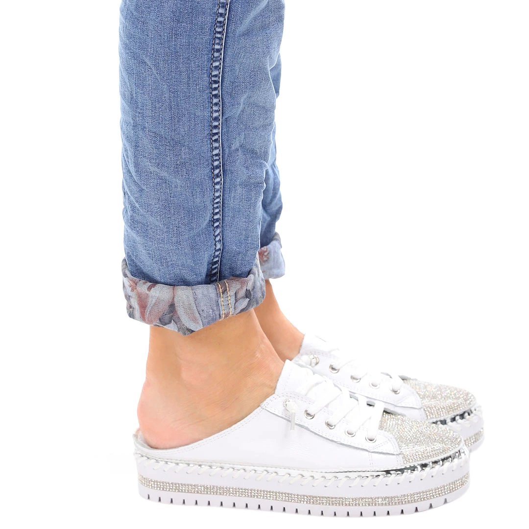 ReplaceĀ the Cinderella slipper with theĀ Sarah SlideĀ inĀ White by Ameise! Brought to life with rhinestone detail all the way round the platform sole, theseĀ White leather slip on shoes are a statement! With a classic lace up across the top of the shoe you’ll walk around with added Pizazz in your step! Comfort footbed and easy to slip on!
