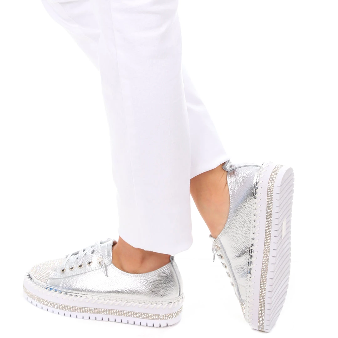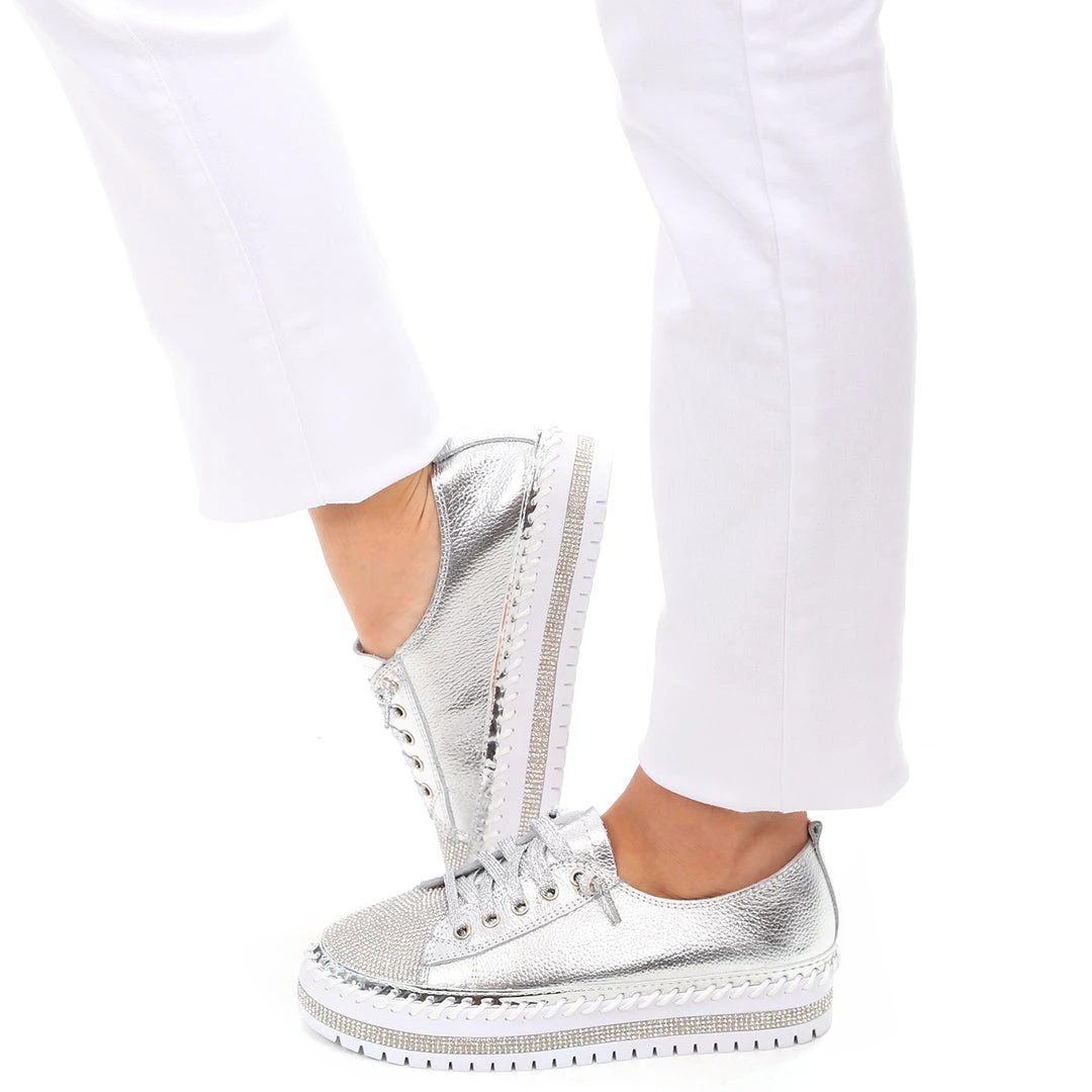 Replace the Cinderella slipper with the Sky Leather Loafer in Silver by Ameise! Brought to life with rhinestone detail all the way round the platform sole, these black leather slip on shoes are a statement! With a classic lace up across the top of the shoe you’ll walk around with added Pizazz in your step! Comfort footbed and easy to slip on!