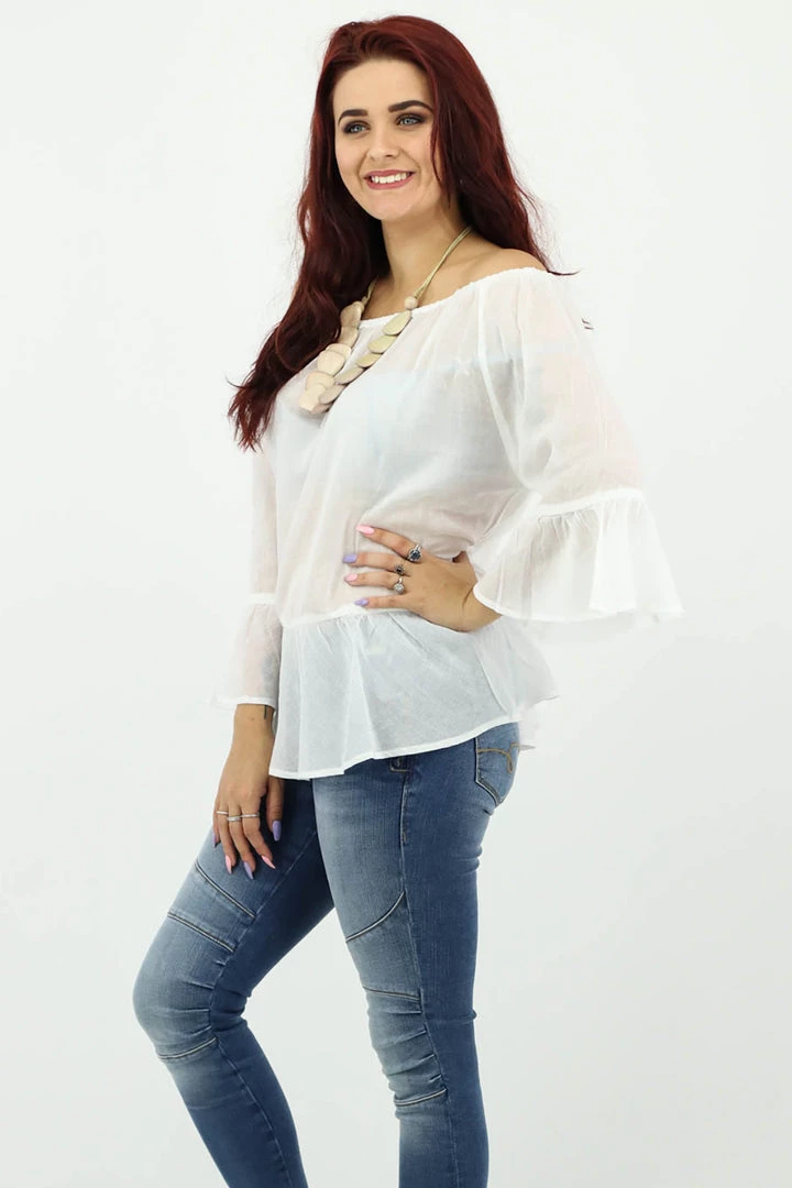 Off the shoulder top by Anannasa in bright orange is perfect to wear with your shorts, pants or pencil skirt. Features elastic neckline with bell sleeves and ruffle hem, very light, cool fabric for hot summer days or nights.