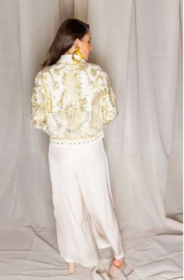 The Stunning new Frida beaded designer jacket has arrived this amazing jacket has beautiful lurex base fabric with metal buttons, a boxy shape to your hips with full length sleeves. This Frida jacket will turn heads every wear you go all for the right reasons.Â