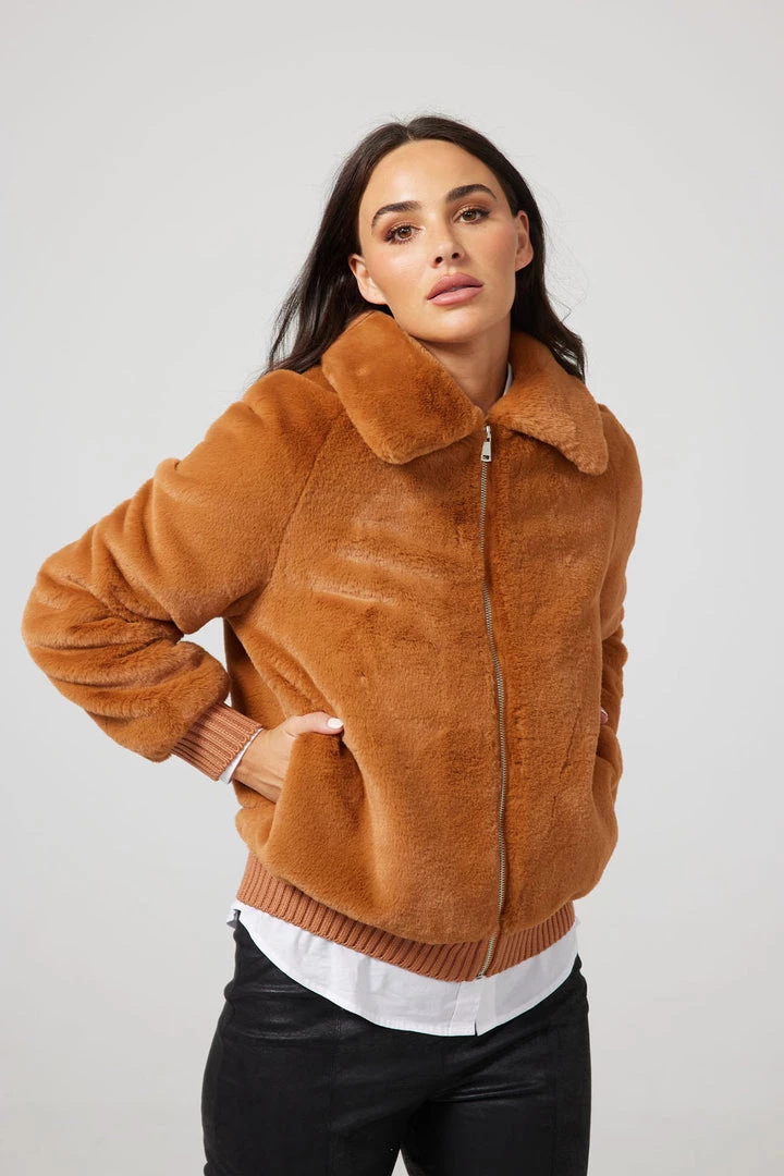 Transport to a wonderland of warmth in the Celeste Bomber. Featuring ribbed cuffs, an oversized collar and metal zip closure, this jacket will keep you cozy and on trend all season.Â