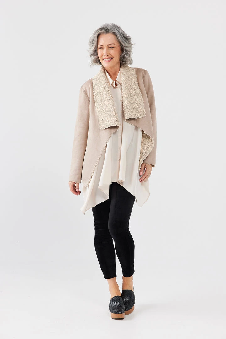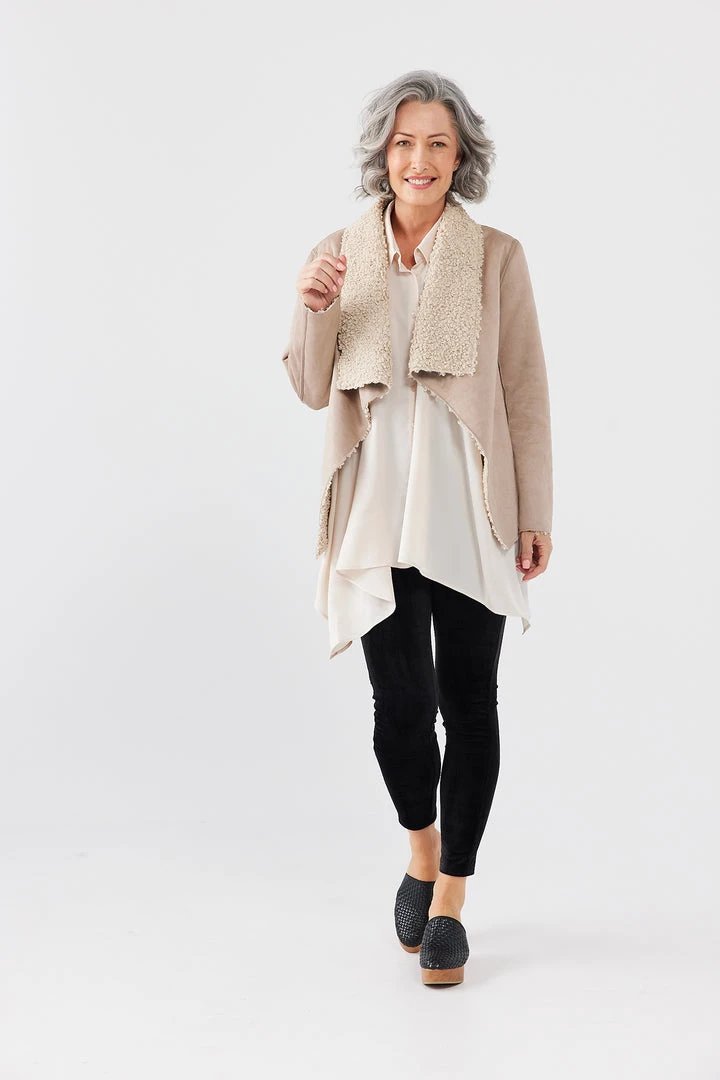 The Dylan jacket is just divine, a must have warm stylish jacket featuring a waterfall collar with a leather binding, open front, fully lined this jacket is a perfect transeasonal Jacket.