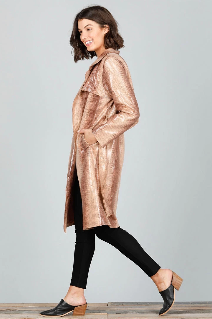 Stop what you’re doing and soak in the wonderful WILD colours and textures of the Safari Trench Coat in Tan Reptile in Faux Leather by Brave + True! Inspired by a slick winter wardrobe this statement trench is reminiscent of warmth and WOW. With a tie waist, Aline silhouette and truly beautiful use of tan snake print, this winter coat is utterly magnificent!