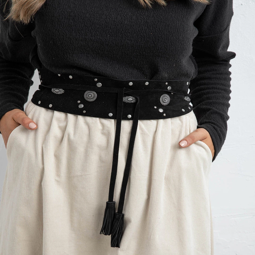 This suede belt is a thick tie up belt with button detailing all round. Its saude leather look brings character and fine detailing into this piece finish off any outfit with this beauty.Â