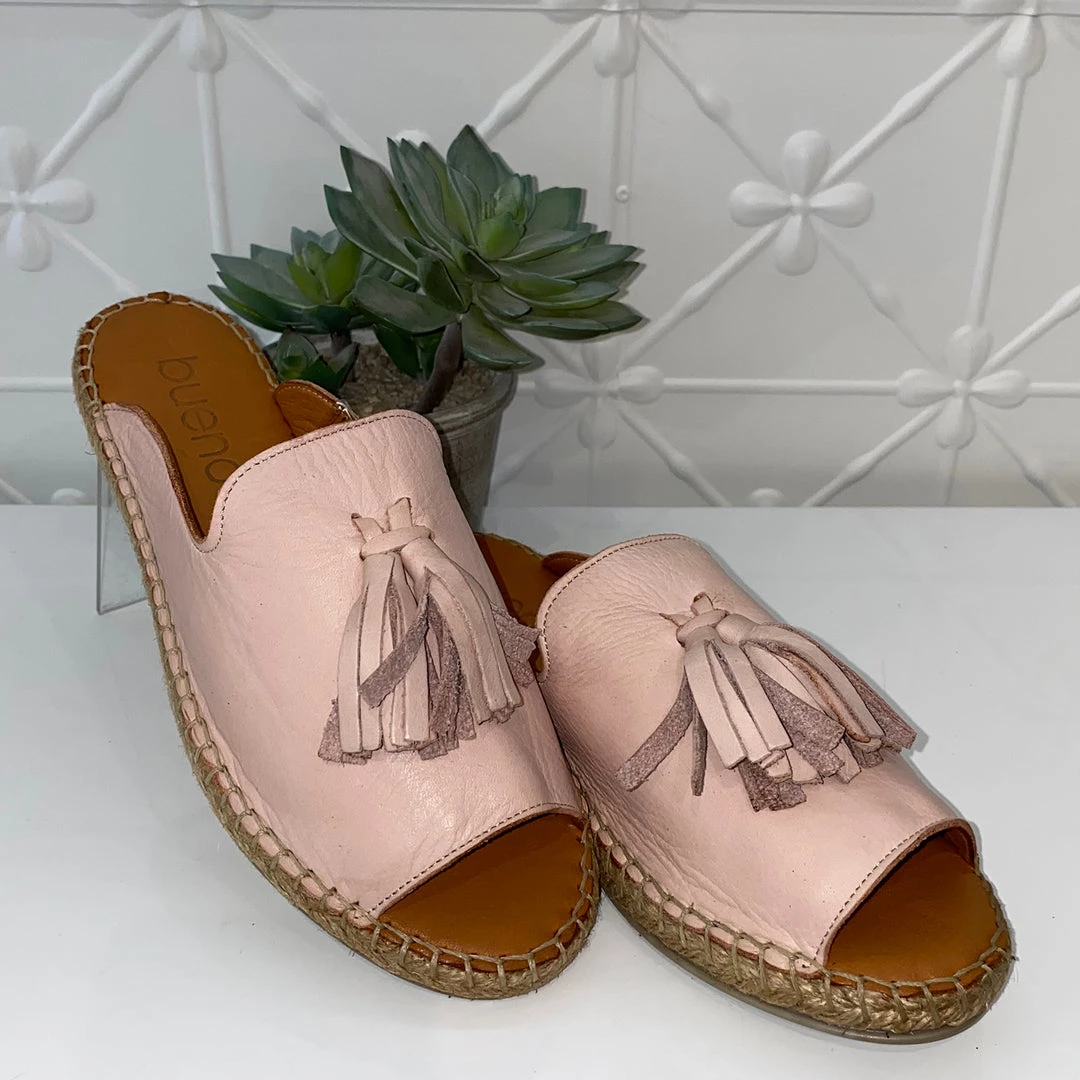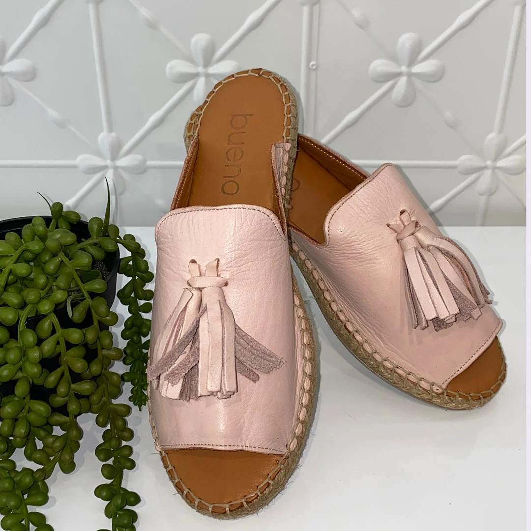 The beauty of a simple slip on espadrille never dates! The Keilor Espadrille in Cameo by Bueno is a must have Summer shoe for every occasion! Slip into the beautiful Turkish made leather slide with easy – the comfort and convenience is unparalleled! With an added touch of Pizazz through the double tassel feature you’ll love the quality and comfort of the Keilor Espadrille!