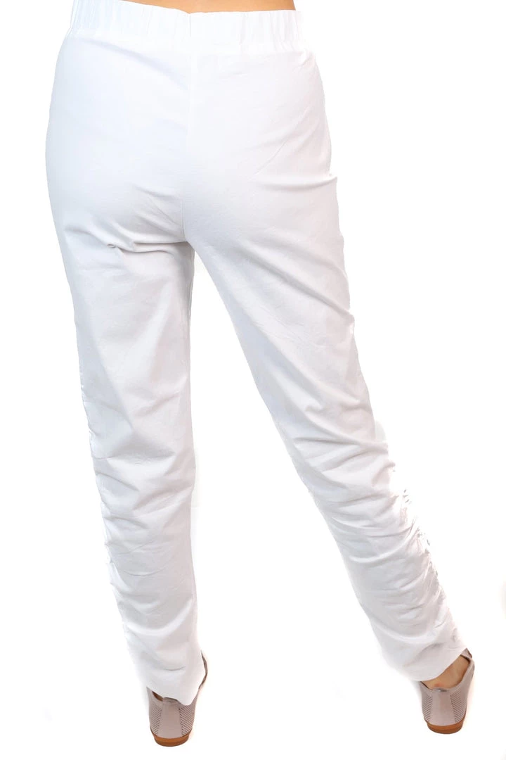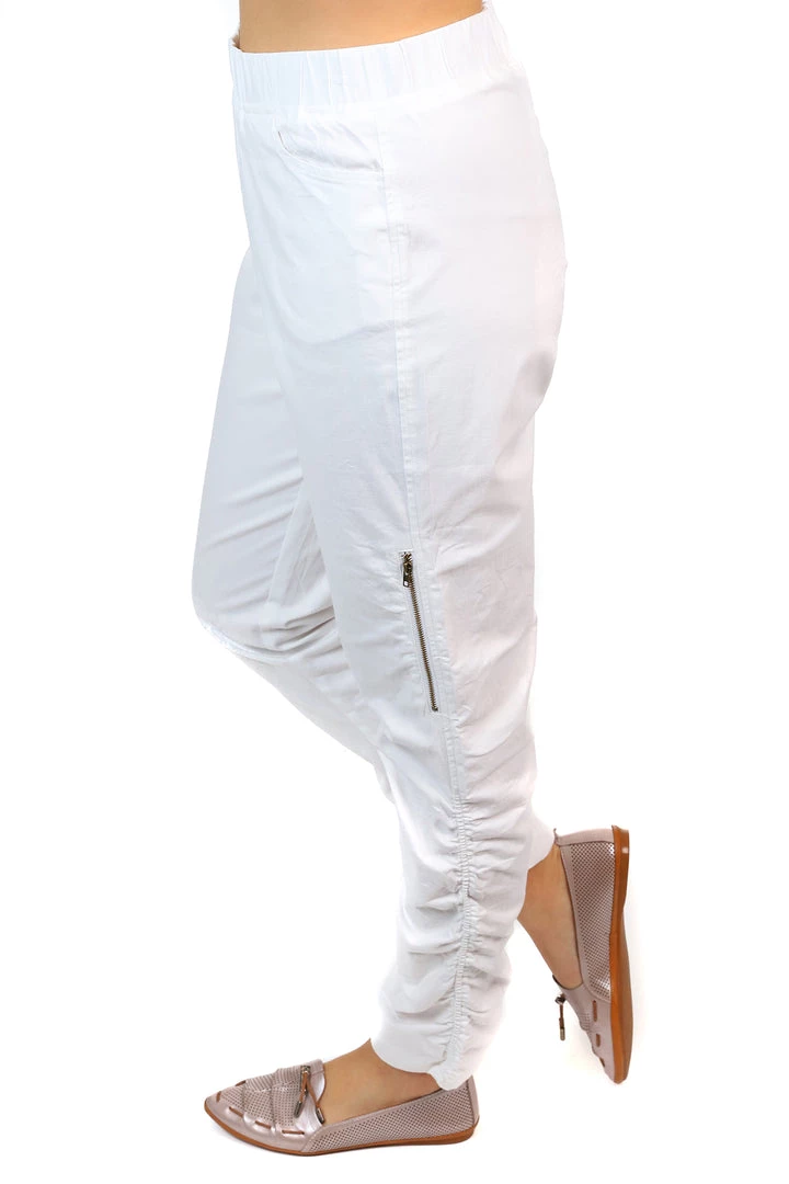 Cafe Latte have designed a Gathered Ankle Size Zip Pant in white that is as easy to pull on as it is to style. Made from a soft stretch fabric these white ankle length pants are versatile and flexible! With ruche detail on the ankle and a stylish zip on the thigh these Cafe Latte pants are trans seasonal winners!