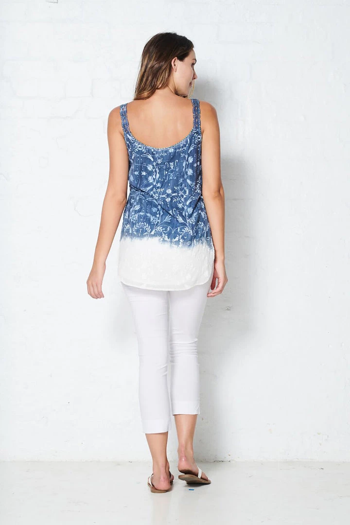 This luscious sleeveless Dip Dye Bead Embroidered Top by Caju is an artistic and inspiring blend of blue and white across a V neck design with a scoop hem. The raw indigo blue cotton blends down into a dip dyed white hem that is picked up throughout the fine print across the top. With length enough to cover your hips at the back and a nice scoop hem this cotton singlet is an unforgettable slice of Summer fashion!