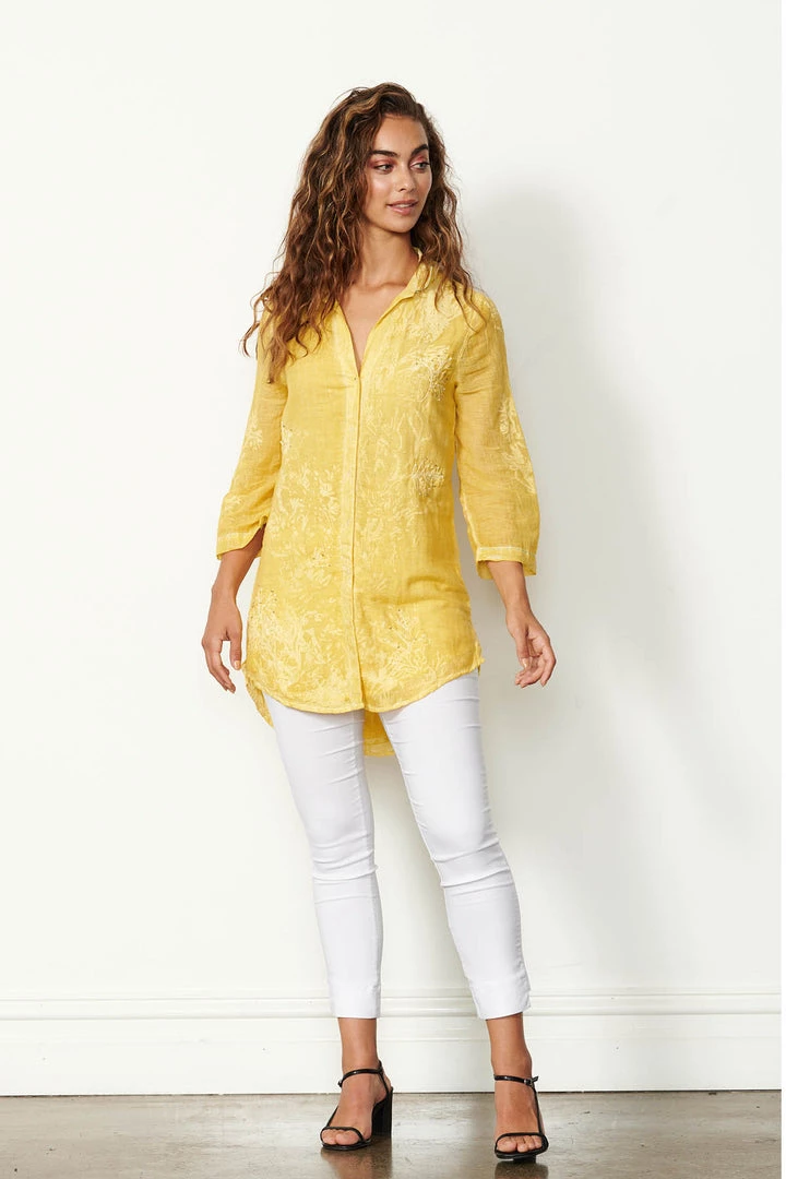 Mellow yellow for summer. This cool and soft, long line button up shirt with collar can be worn over you’re swimmers or out to dinner. The bodice is lined with a soft cotton. 3/4 sleeve that can be rolled up and secured with a button tab. There is a light white painted coral print on the shirt with touches of beads and embroidery that aren’t over the top.Â