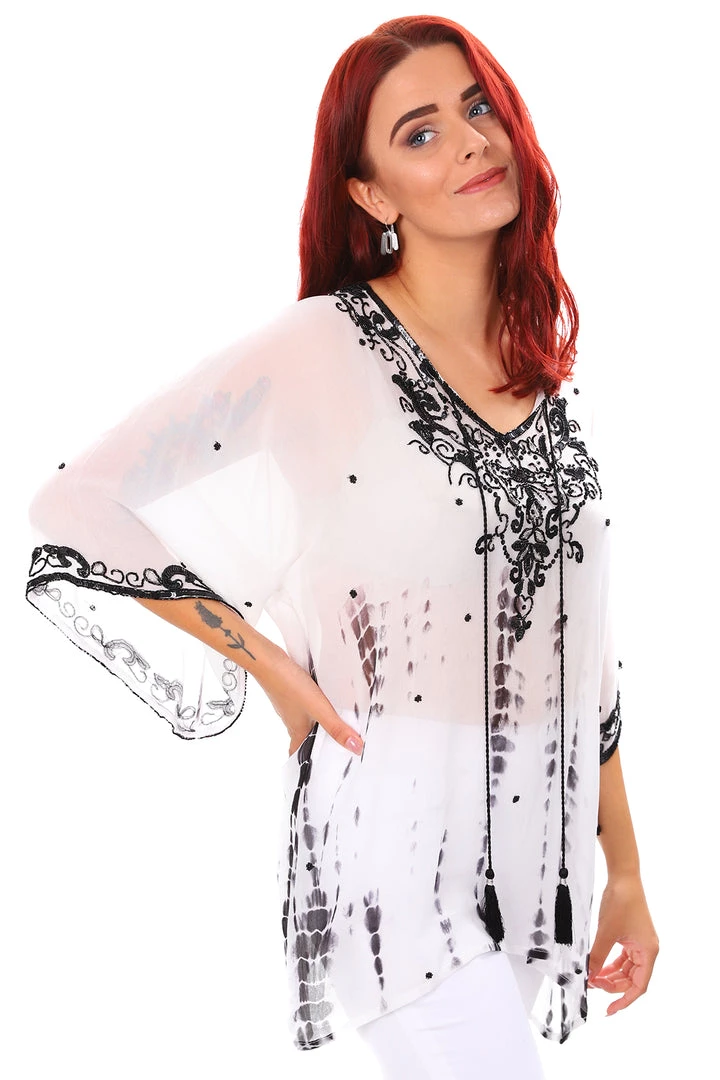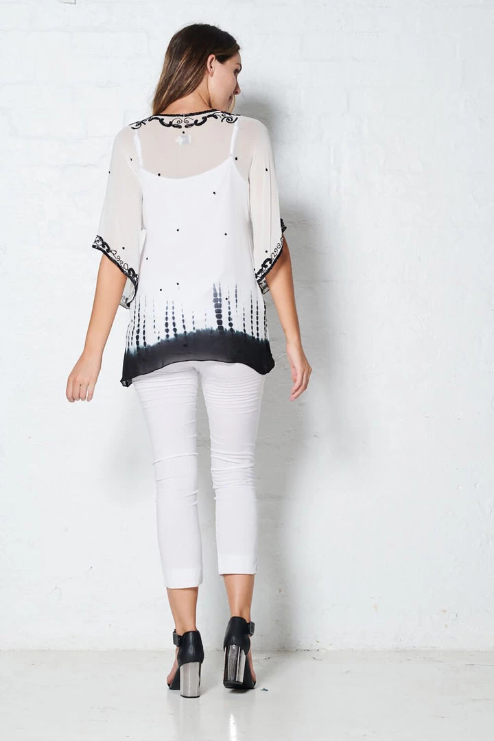 Casual glamour is a statement you want to make this season, and the Beaded Dip Dye Blouse by Caju is here, loud and clear! With a wide feminine sleeve and tassel neckline this white top is lifted by black detailing and bead work. The light and floaty fabric is ideal for warm Summer nights and days. Dip dyed effect on the hem adds a casual element, while the exotic beading takes this Caju top to a whole new level. Over a pair of white jeans this relaxed fitting piece is divine!