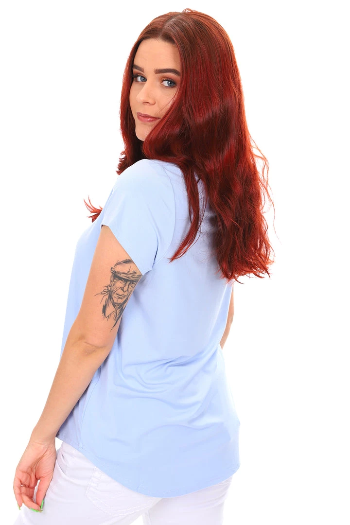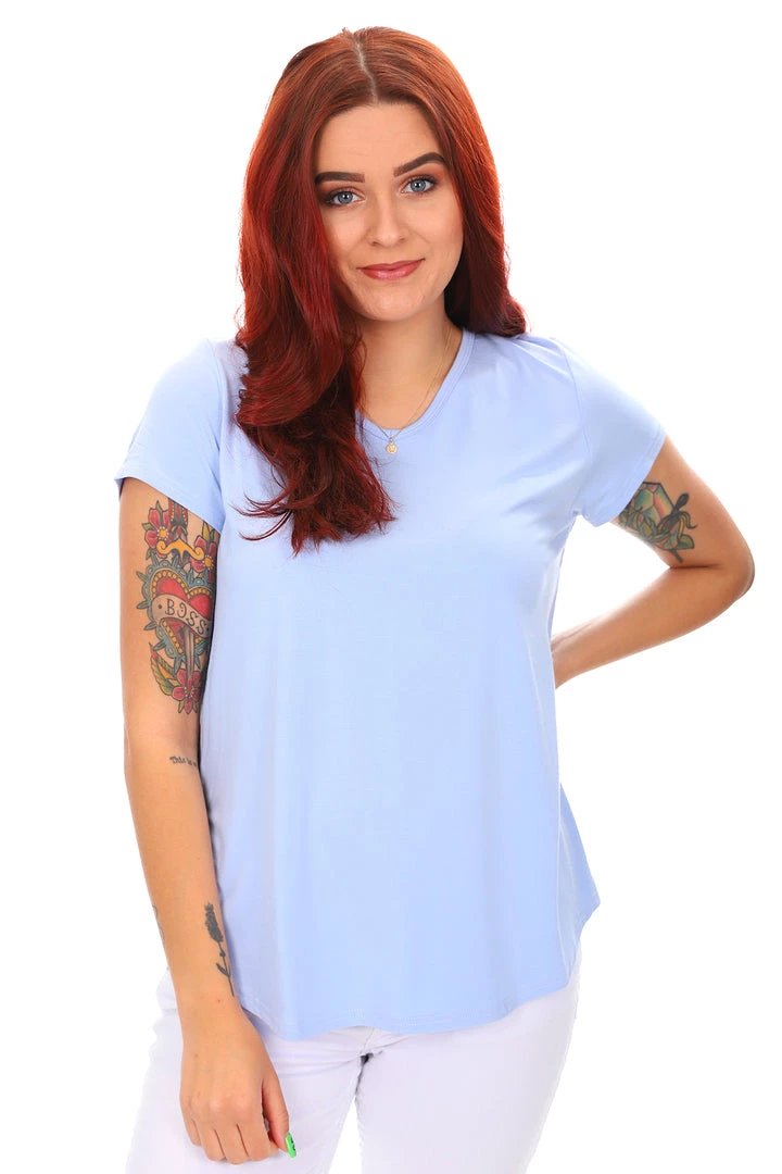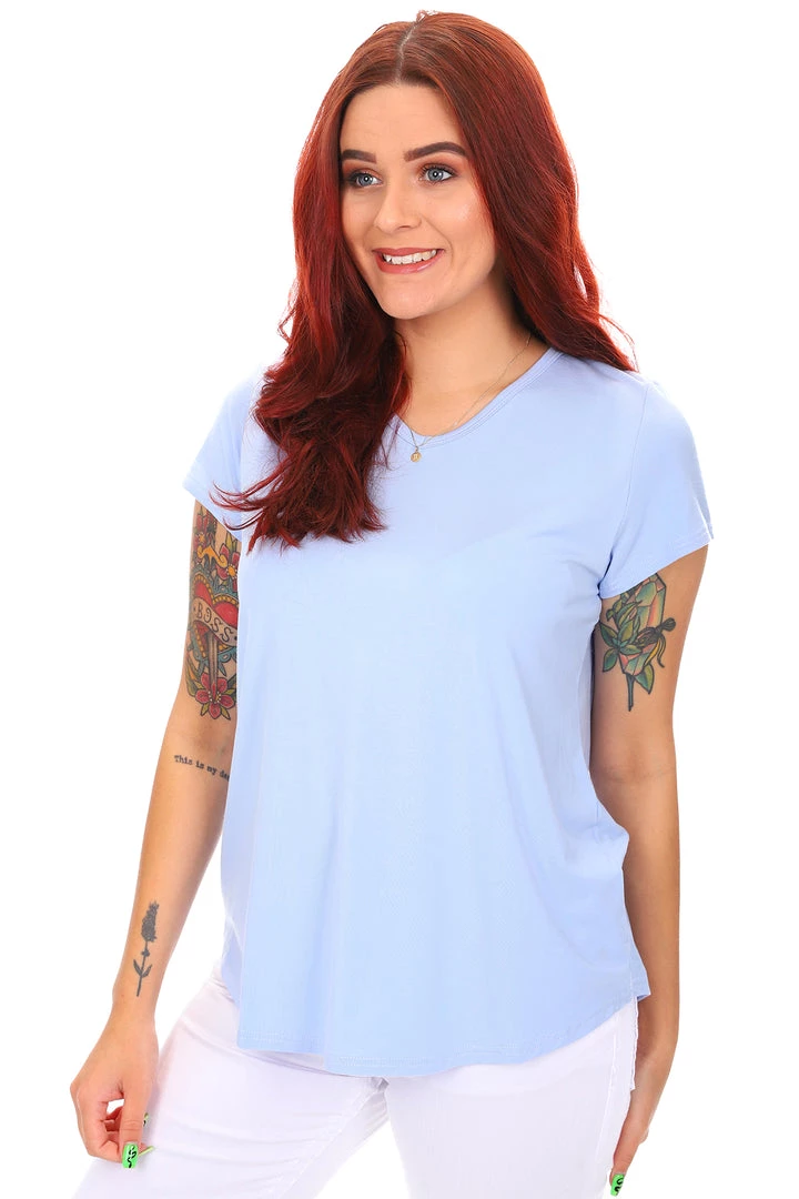The cornflower V neck bamboo tee by Whispers is a light weight, breathable basic to add to your every occasion wardrobe! With a short sleeve, fitted cut and comfortable stretch this cornflower bamboo top is a must have staple for all days!