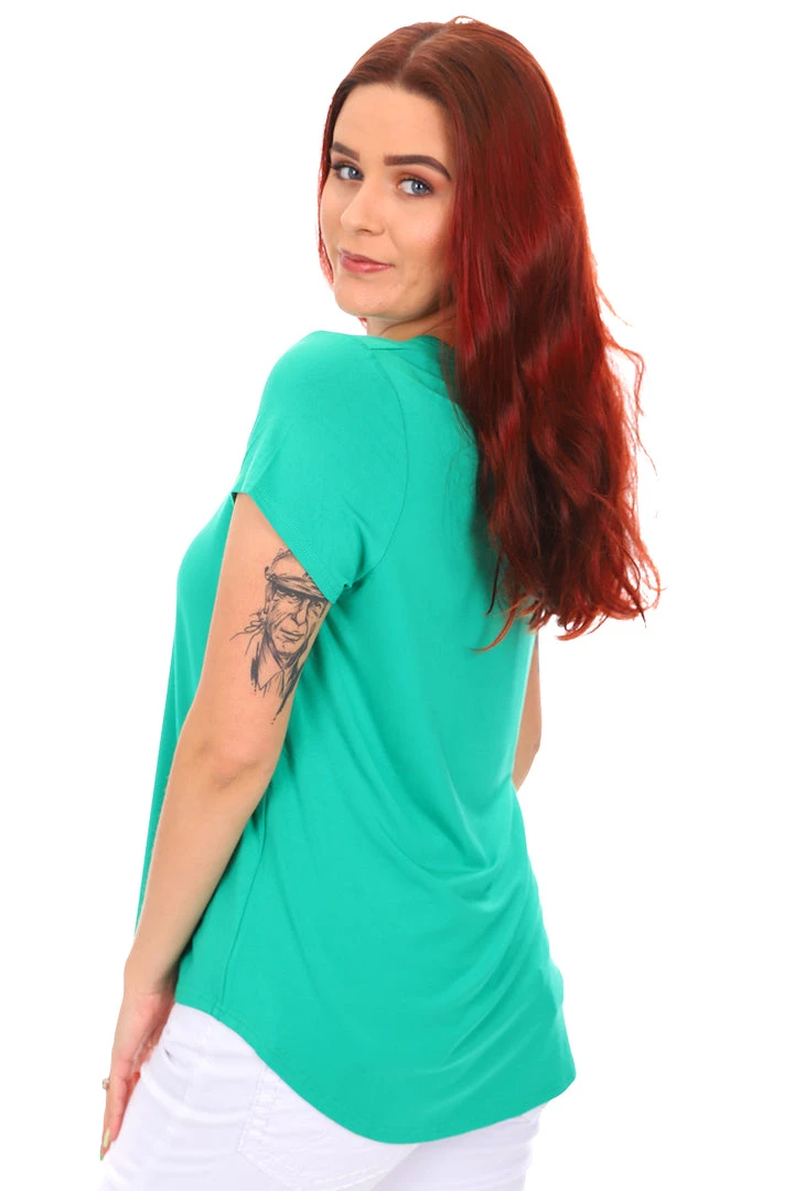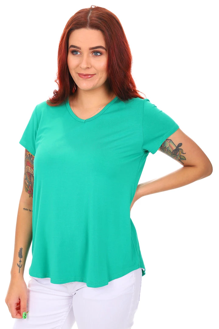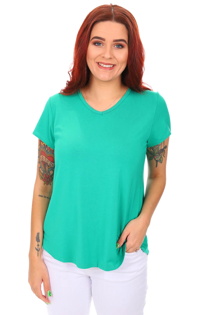 TheĀ emerald V neck bamboo tee by Whispers is a light weight, breathable basic to add to your every occasion wardrobe! With a short sleeve, fitted cut and comfortable stretch thisĀ greenĀ bamboo top is a must have staple for all days!
