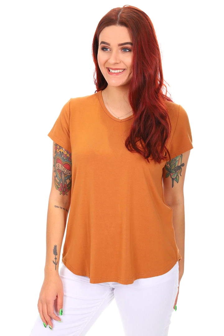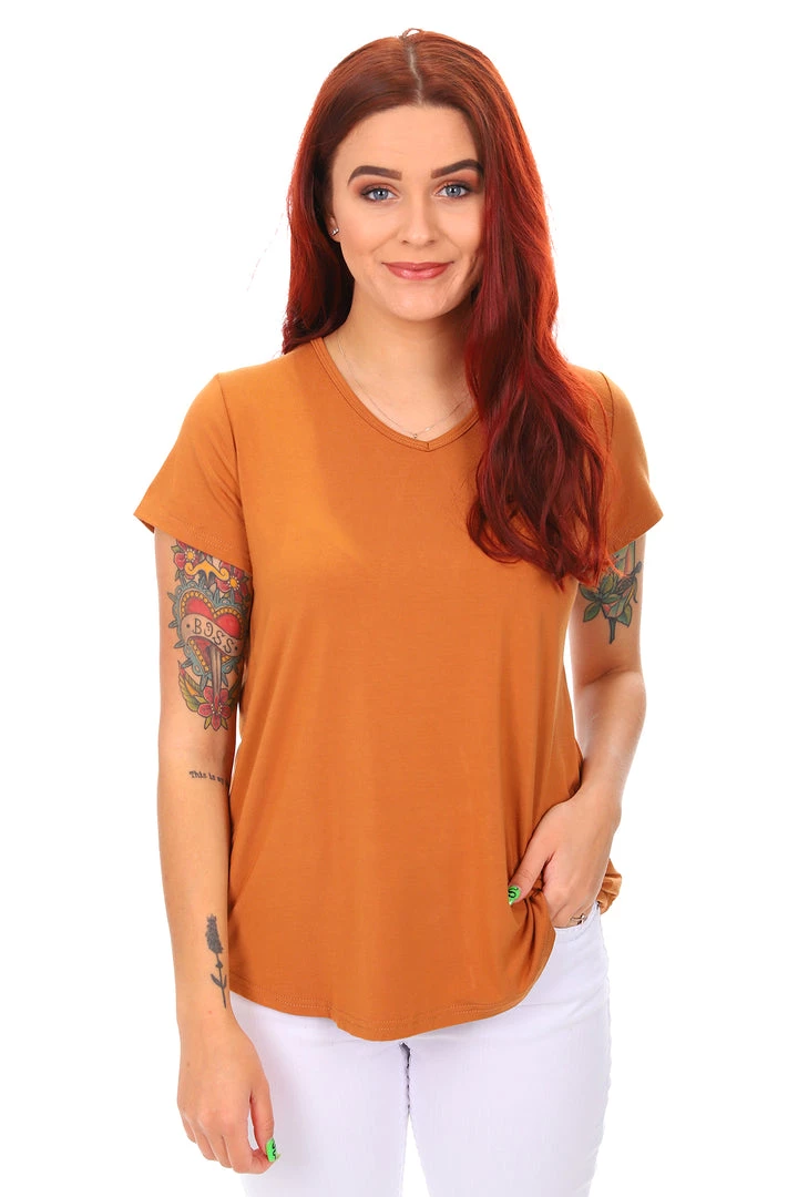 The tobacco V neck bamboo tee by Whispers is a light weight, breathable basic to add to your every occasion wardrobe! With a short sleeve, fitted cut and comfortable stretch this tobacco bamboo top is a must have staple for all days!