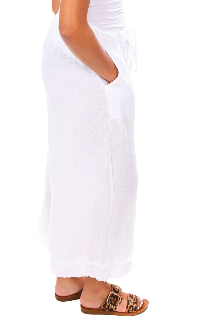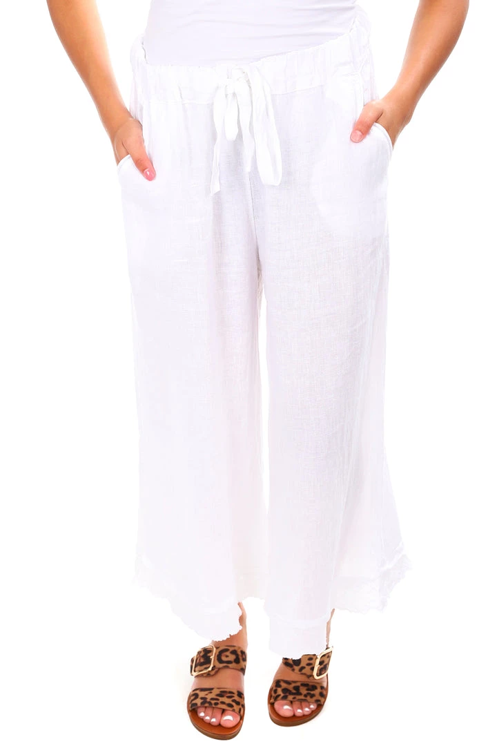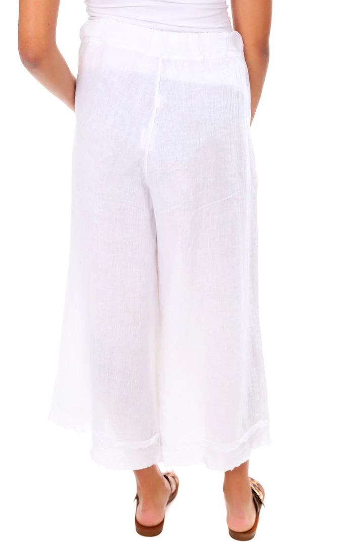 The Frayed Hem Linen Pants in White by Wednesday Lulu are a super light weight pant featuring a drawstring waist. With generous pockets and a dreamy wide leg this summer basic is comfortable, practical and full of Pizazz. Add a sandal and an ice coffee to create the ultimate Summer look this season!