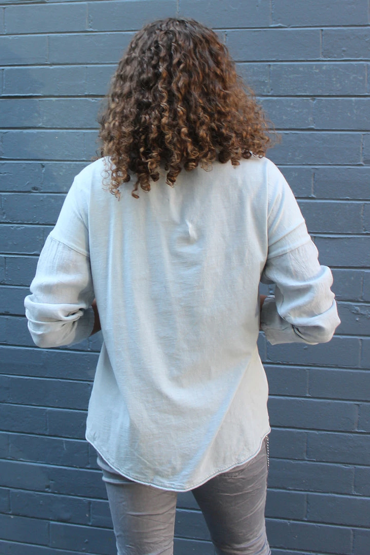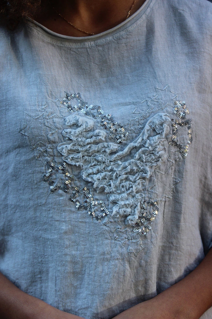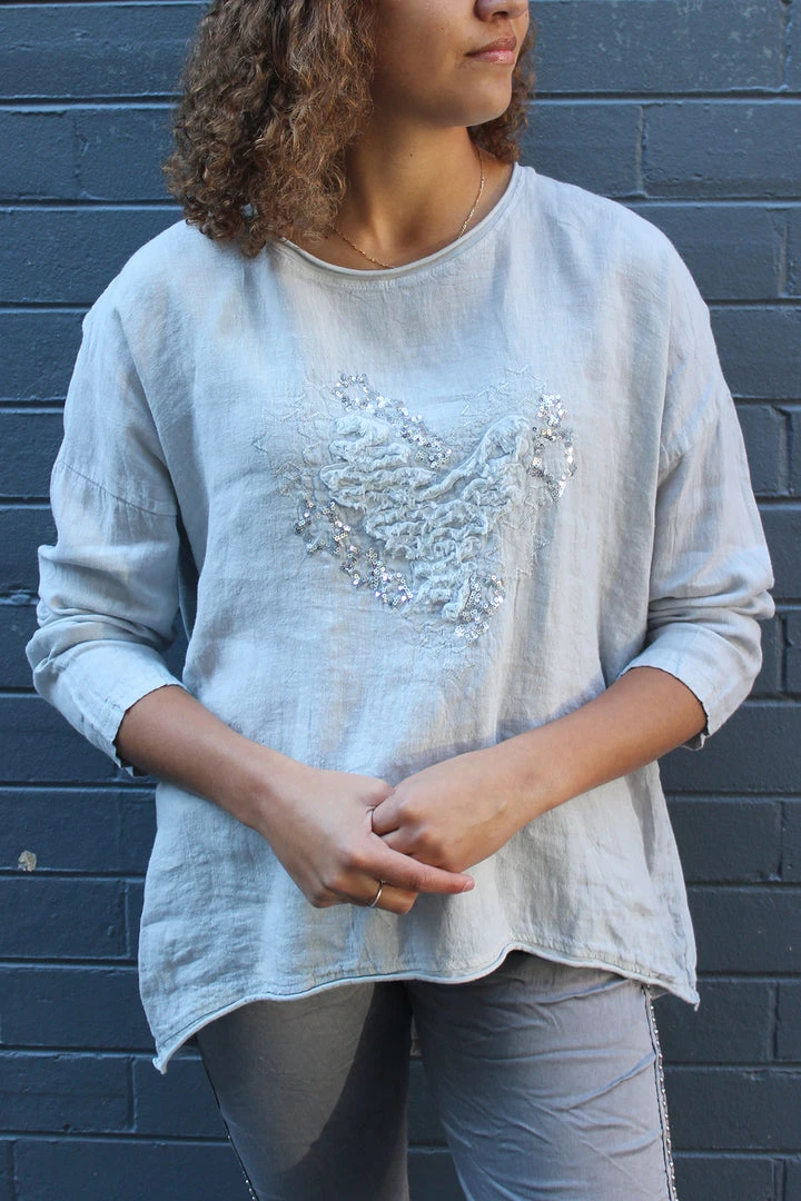 Cest Parfait has created this beautiful linen cotton long sleeve top in grey which features a beautiful heart shaped by stars & filled with ruffle detailing. *adds to cart*