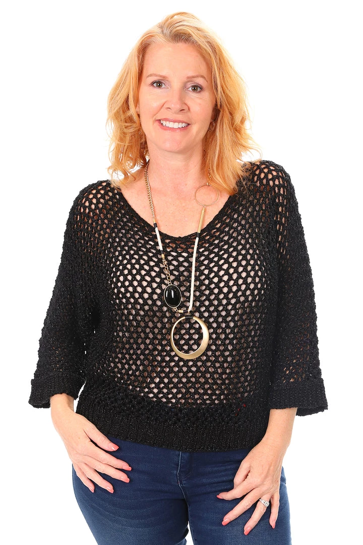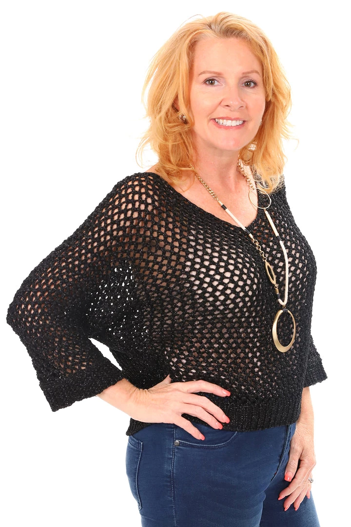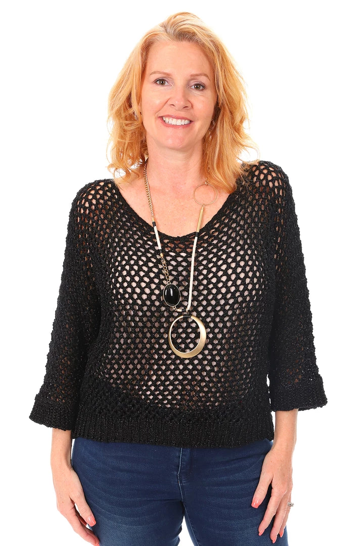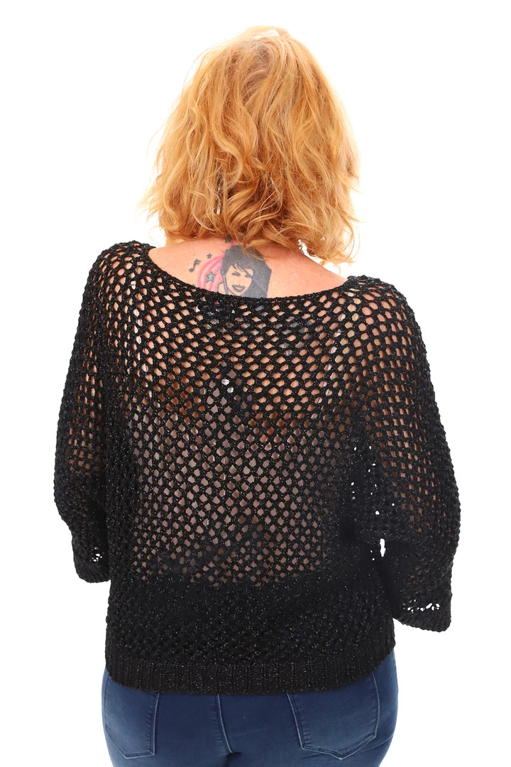 These tops are eminently stylish and wearable. Team with your favourite singlet, denim pants & boots for a classic winter look. This exquisite open weave black knit has a silver thread which sets these knit apart, add you favorite jacket for extra warmth. Â