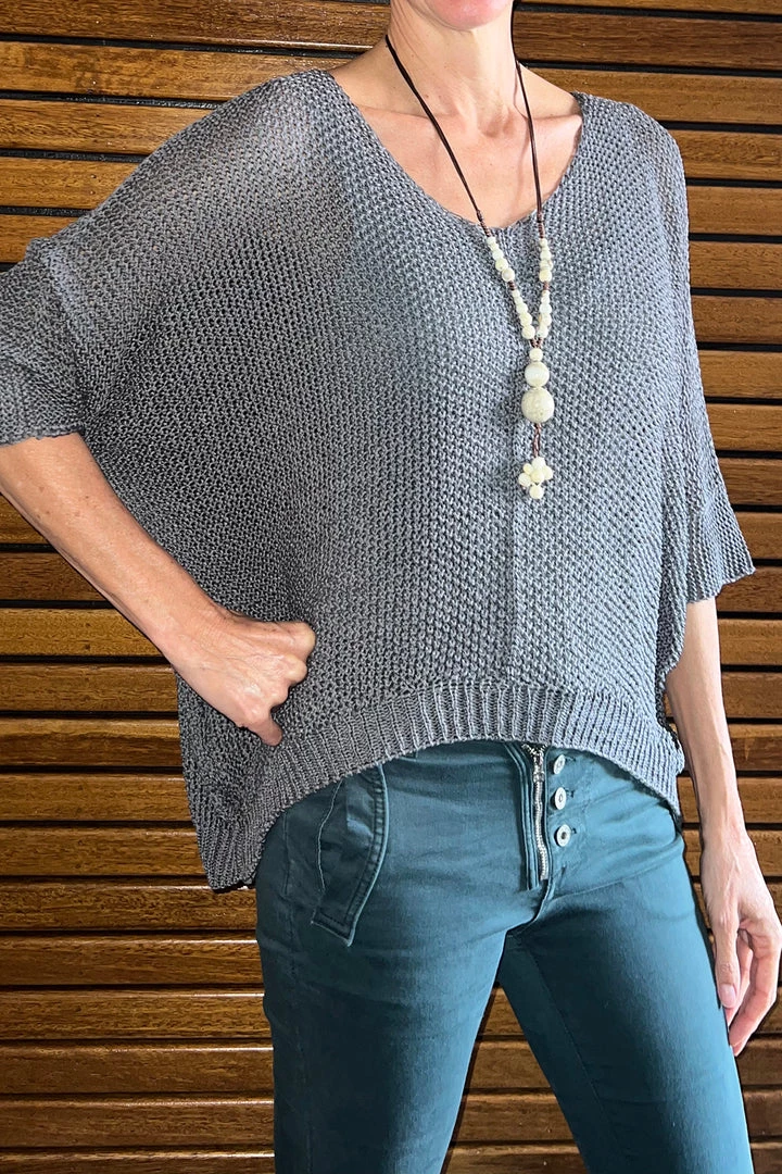 Fresh, feminine and versatile; this Knit Top in Charcoal by Cindy G is here to serve & style you! Made from a 100% cotton this Soft top is a relaxed fitting piece that is as easy to wear as it is to fall in love with! The soft knitted silhouette bounces nicely off the subtle V neck to create an effortless charm that is ideal to pair with linen pants! Perfect with a soft singlet underneath.