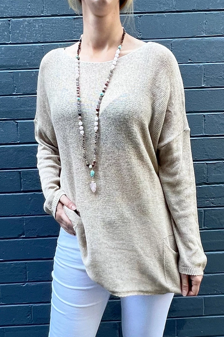 The relaxed knit top in beige By Cindy G is a great little knit so easy & Versatile the relaxed knit top has two front pockets, round neck line. The relaxed knit top is great for layering or on its own.Â
