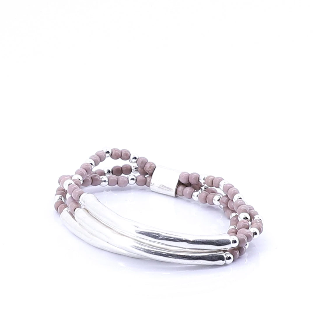 Beautiful elasticised bracelet with matte stone beading and silver highlights, featuring three silver bars across three strands.Â