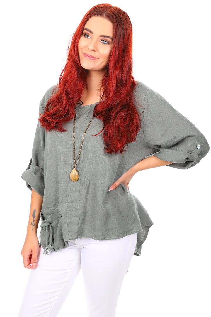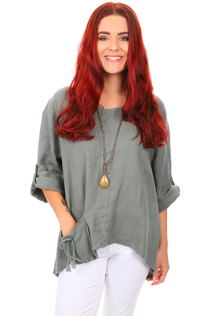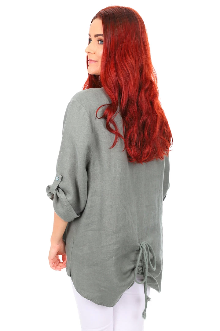 Looking for a soft, versatile linen top that will pair with everything this season? The Sea Green Drawstring Linen Top by Cindy G is the answer to your prayers! The light weight soft khaki linen fabric is breathable, relaxed and shown off perfectly through the roll up sleeves and feature pocket. With a hi low hemline and drawstring feature on the back this linen top is relaxed to suit your Summer lifestyle.