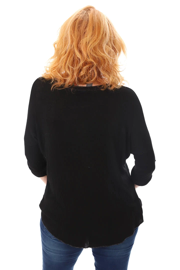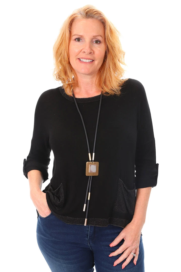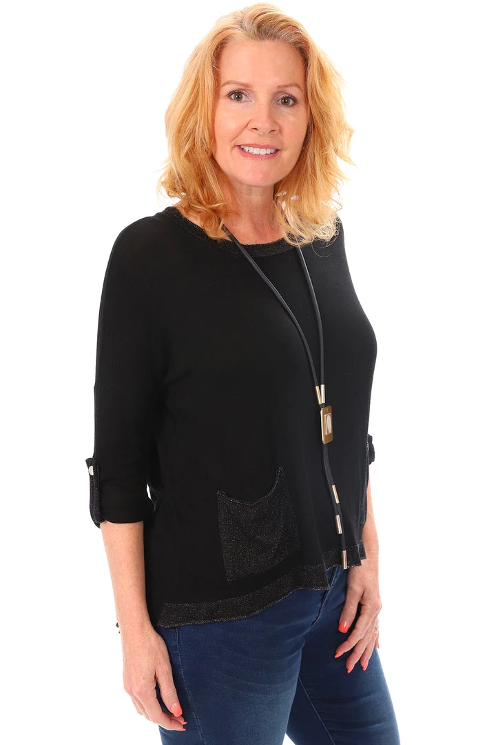 Get ready to meet your new favourite top! there is nothing boring about this little black top and the team at Pizazz rate it as a must have this fashion season! This lovely knit top is designed and made in Italy by Cindy G. The quality design features a high low hemline and 7/8 roll up sleeves with a button tab at the elbow. The top also features a pocket in contrasting metallic silver and metallic bands at the neckline and on the button tabs on the sleeves. Team this knit with your favourite jogger pants or  jeans. Make a statement by adding a silver glitter shoe or warm things up with a high black boot and dark denim jeans.