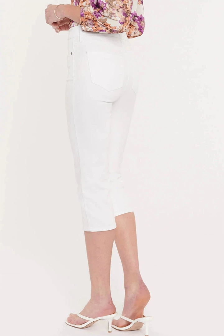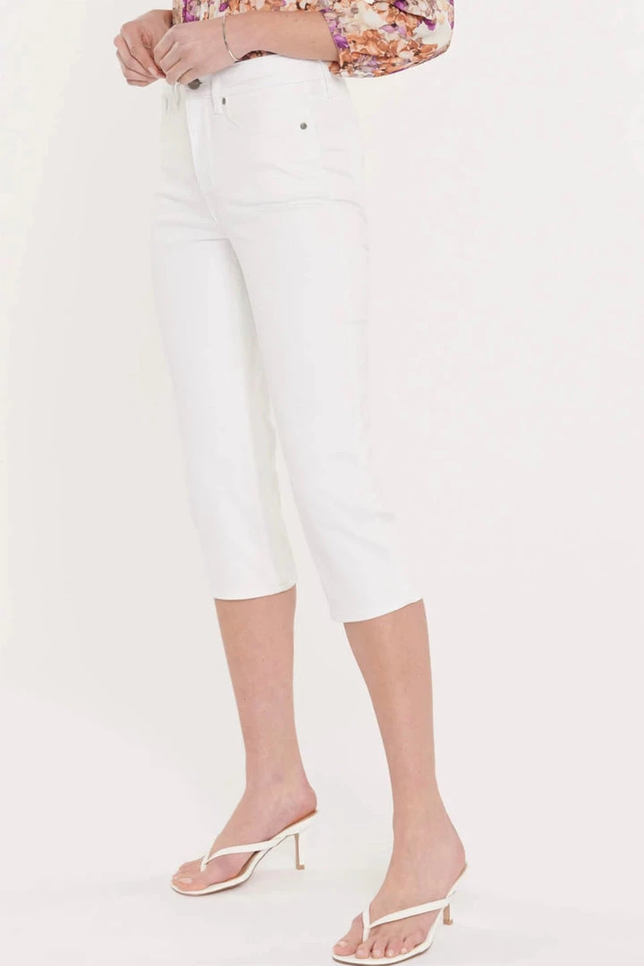 The ThighShaper™ Straight Crop Jeans in Future Fit Denim® by NYDJ are a new design intended to slim and shape thighs with a high-stretch knit compression panel which some women report helps to aid in the reduction of inner-thigh rubbing. With their cropped length and flattering silhouette, these jeans are destined to become your warm-weather go-to. To enhance their shaping benefits, Future Fit Denim® provides additional all-over compression that may help even contours, and Lift Tuck® Technology uses a proprietary slimming panel with a patented criss-cross design that may help to smooth and support curves. Finished with classic five-pocket styling, zip fly and button closure.