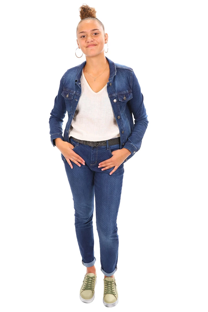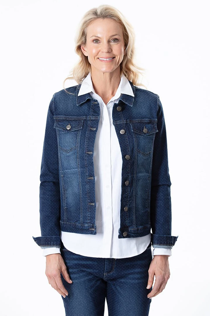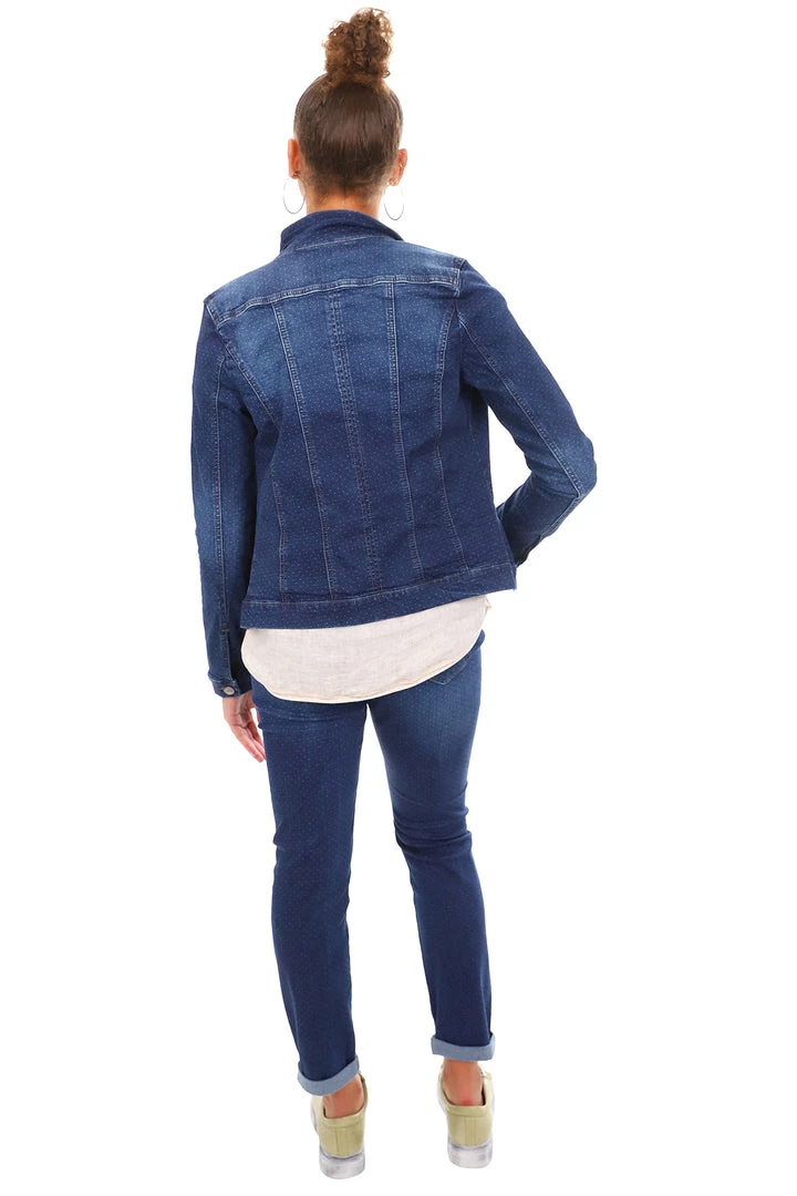 The Corfu Denim Jacket is a must have for your wardrobe this season! Â Dark blue denim with a faded look on the front and back, long sleeves, collar and button up. Also features 4 pockets on the front. Â Comfortable stretch fabric. Wear with jeans or over your favourite casual dress with leggings and boots.