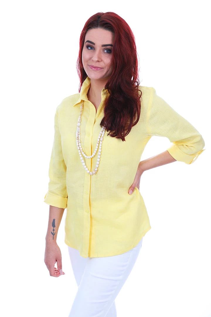 Welcome Spring and Summer in STYLE! This luscious Tab Sleeve Linen Shirt in Yellow by Corsican is a fresh and exciting addition to your Summer wardrobe! The juicy yellow linen adds a touch of Pizazz to your life, while her 3/4 sleeve, collar and same coloured buttons allows you to dress it up or down. Perfect with a nude lip and heel!