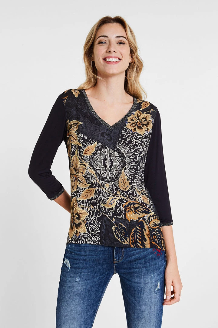 The v-neck and three-quarter sleeve cuffs of this Desigual tee literally shine. Why? Thanks to the use of metallic lurex thread that, in addition, combines perfectly with the boho floral print finished with rounded gold studs. Your individual style will shine when you team this Desigual top with your favourite denim jeans. Add a high boot for a great winter fashion look.