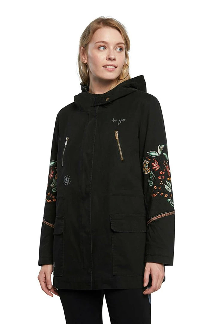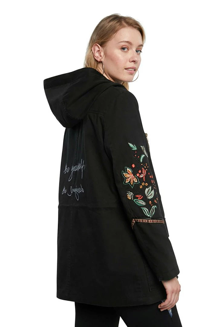 Looking for a jacket with loose and comfortable fit? Bet on this parka with hood in canvas fabric that also has friezes and multicolour floral embroideries on its sleeves.