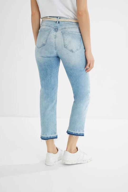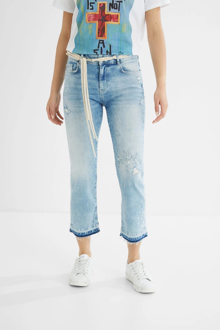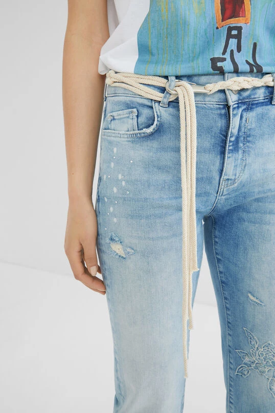 These slim cropped jeans not only display floral embroideries, bright rhinestone beads and washed/worn effect with rips… they also include a belt with braided cords with snap hook.