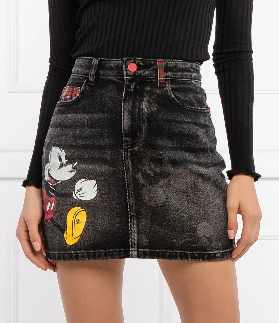 This seasons denim jeans from desigual, in a digital print with patches like the vintage illustrations of Mickey Mouse with the washed/worn effect button with zip and two front pockets.