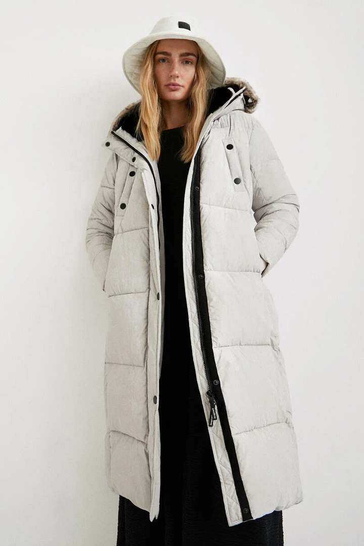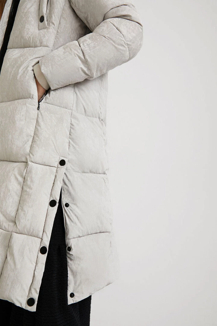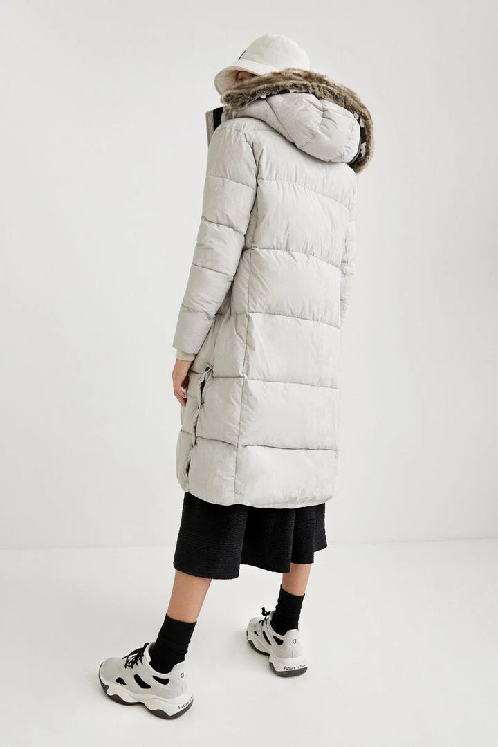 Feel the warmth this winter with this long padded jacket. Its hood is of the same fabric with soft synthetic fur adds comfort and warmth, this jacket offers a split button side and pockets.