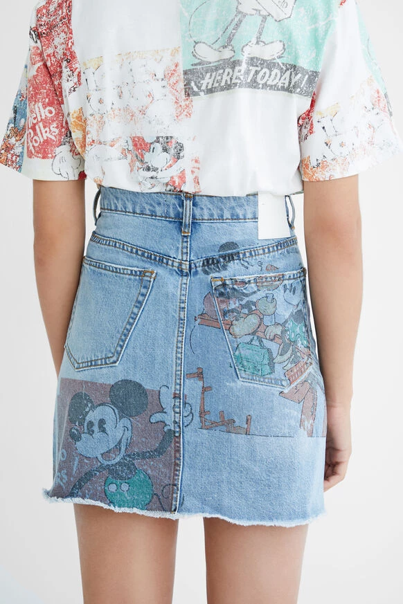 This seasons denim jeans from desigual, in a digital print with patches like the vintage illustrations of Mickey Mouse with the washed/worn effect button with zip and two front pockets.