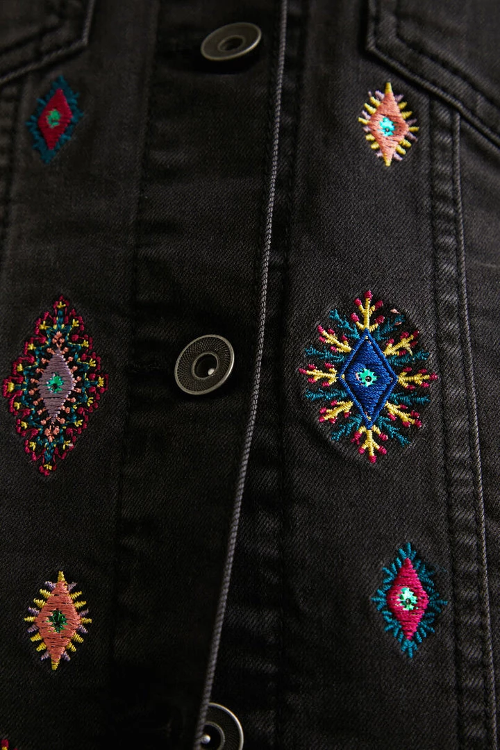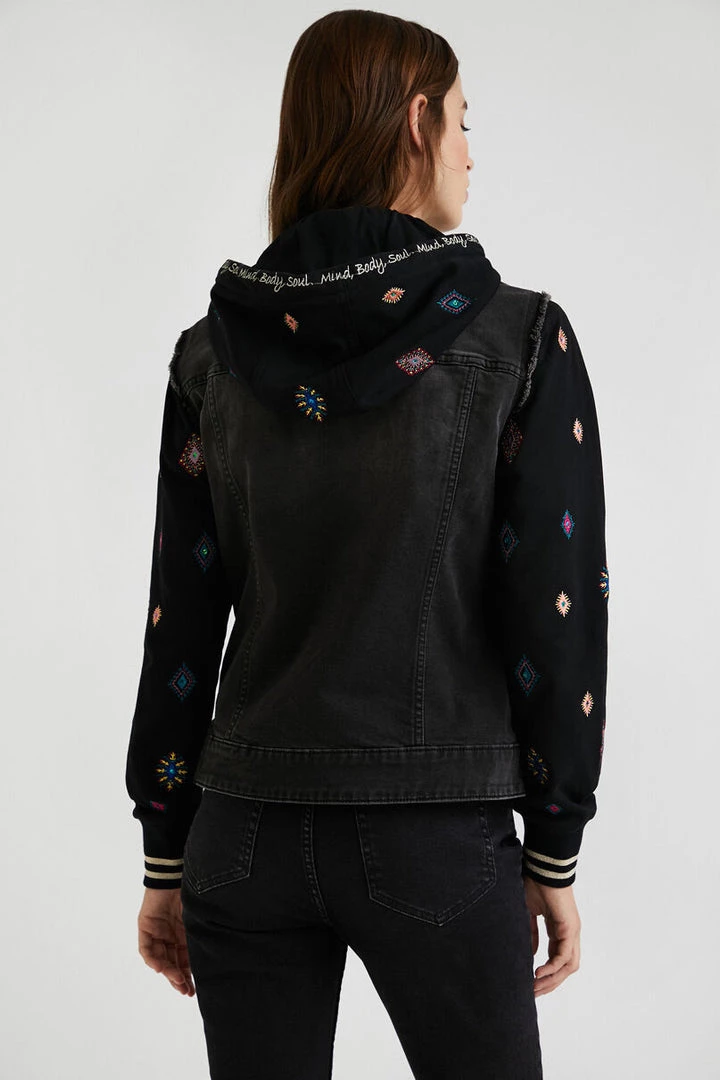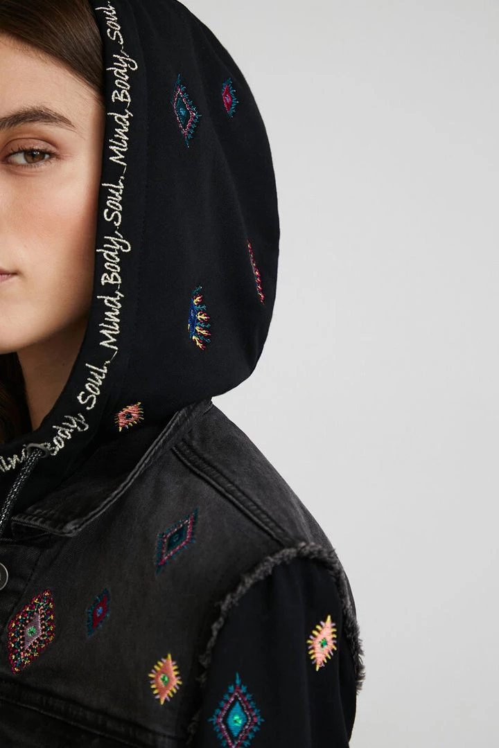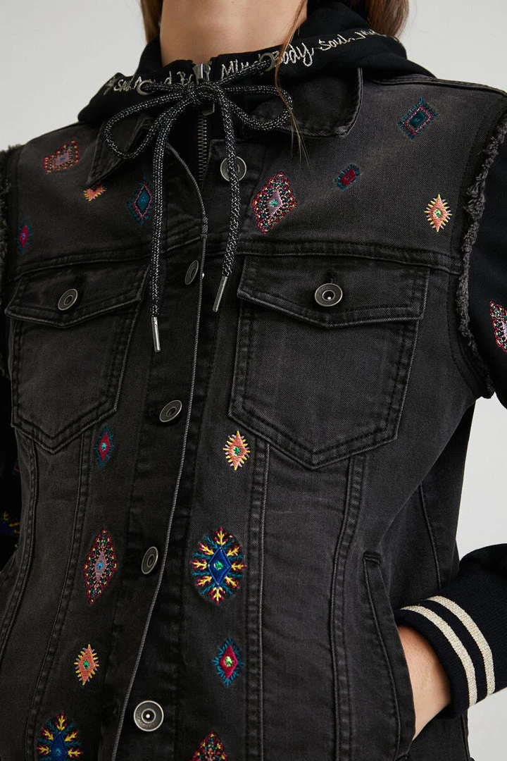Desigual is a brand which is synonymous designer style. This sweater with a hood and a denim vest cut out over the top makes this jacket become an everyday garment to combine with your casual clothes. With print of matching embroideries of coloured diamonds , it looks perfect with any lower garment. even more this jacket will be cossy and comfortable while showing your unique style when you wear this jacket.