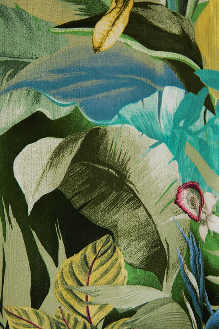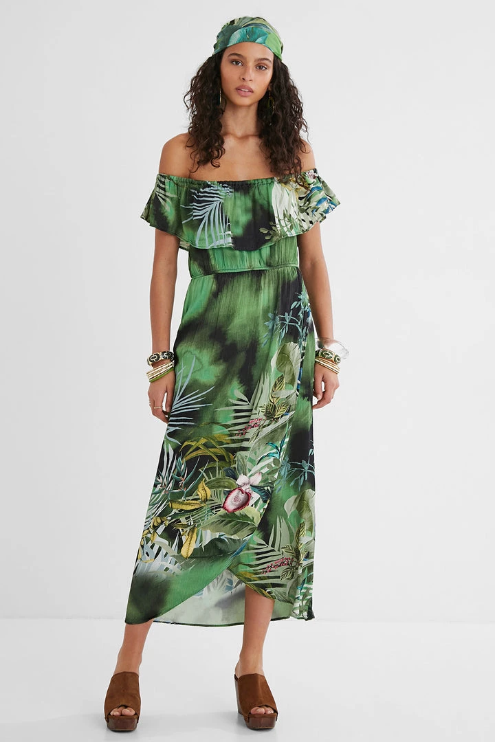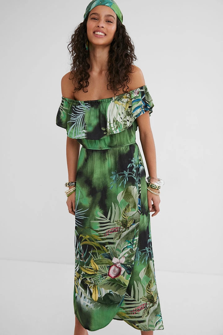 Dreaming of a tropical island holiday? Pop this winner on and you will like you are there. The strapless boat neck is designed with a beautiful flounce and is eco-friendly! Part of the skirt fastened on one side in a beach pareo style.Â