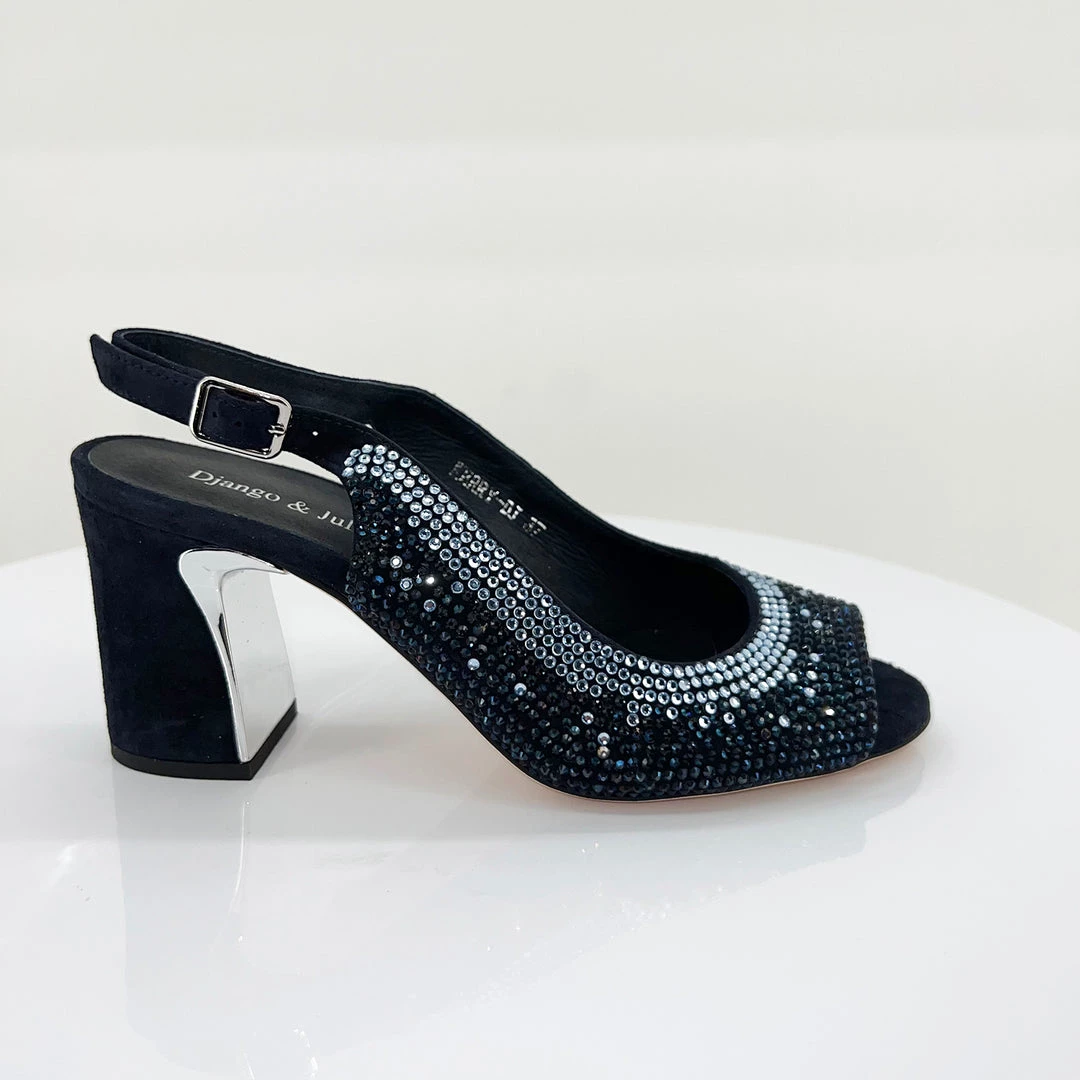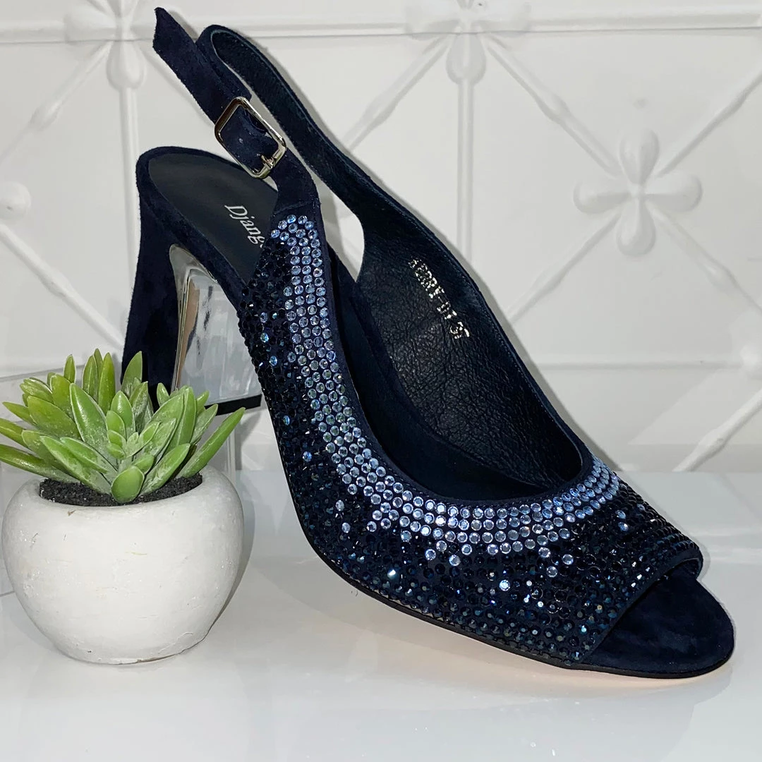 The Kerry Heel in Navy by Django & Juliette is a glowing statement open toe heel that reminds us all that diamonds are a girl’s best friend! The leather upper features a fashionable sling back, round toe shape that works with the block shape heel and gives a canvas for the diamonds to shine on. This Django & Juliette heel also has a navy highlight in the heel. Glam your every day or evening outfit up with the Navy Kerry Heels!