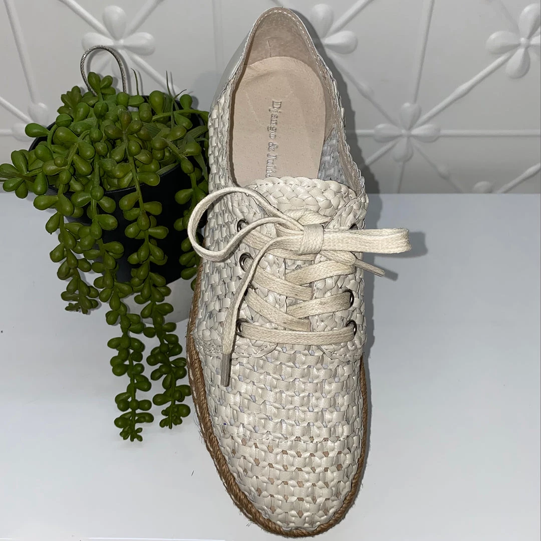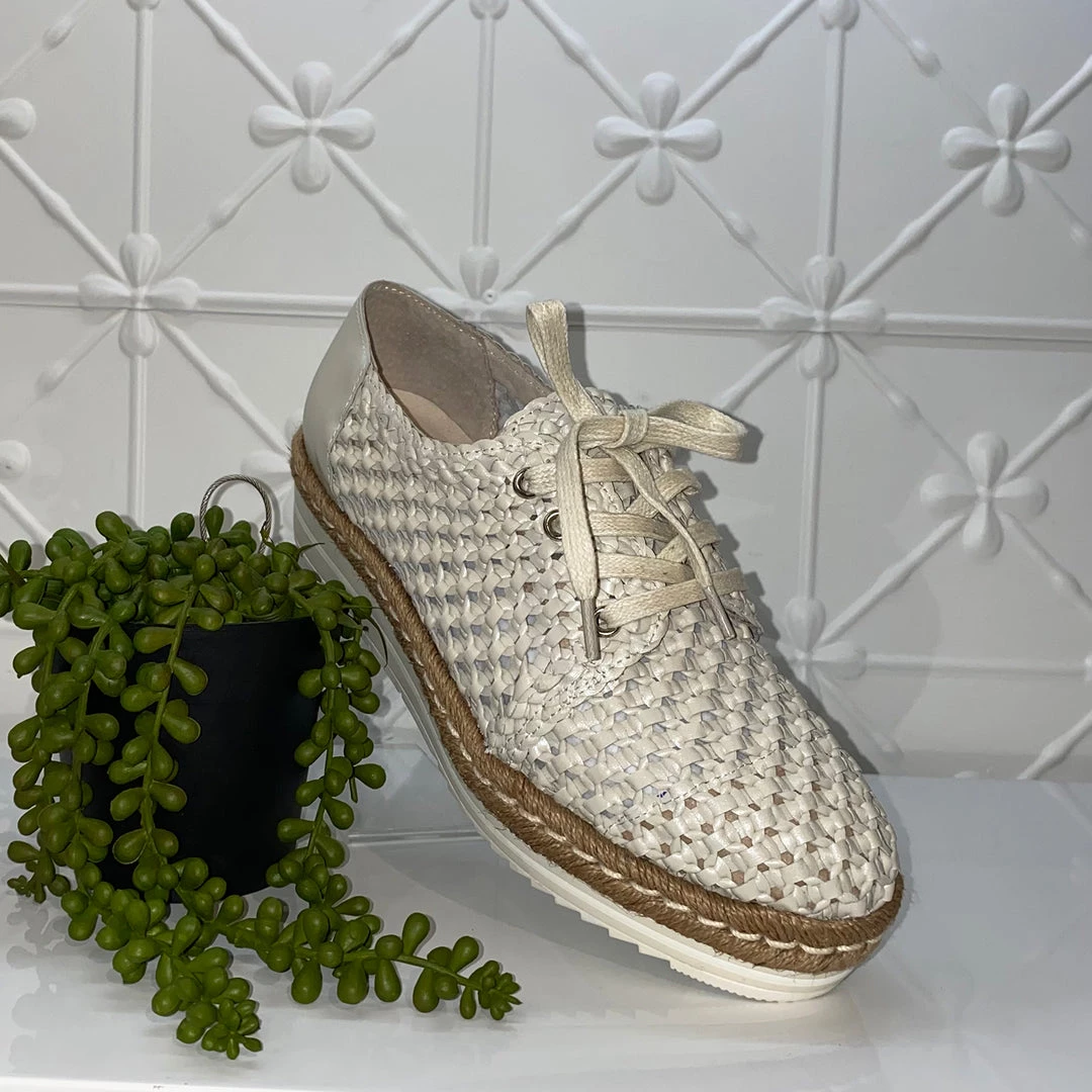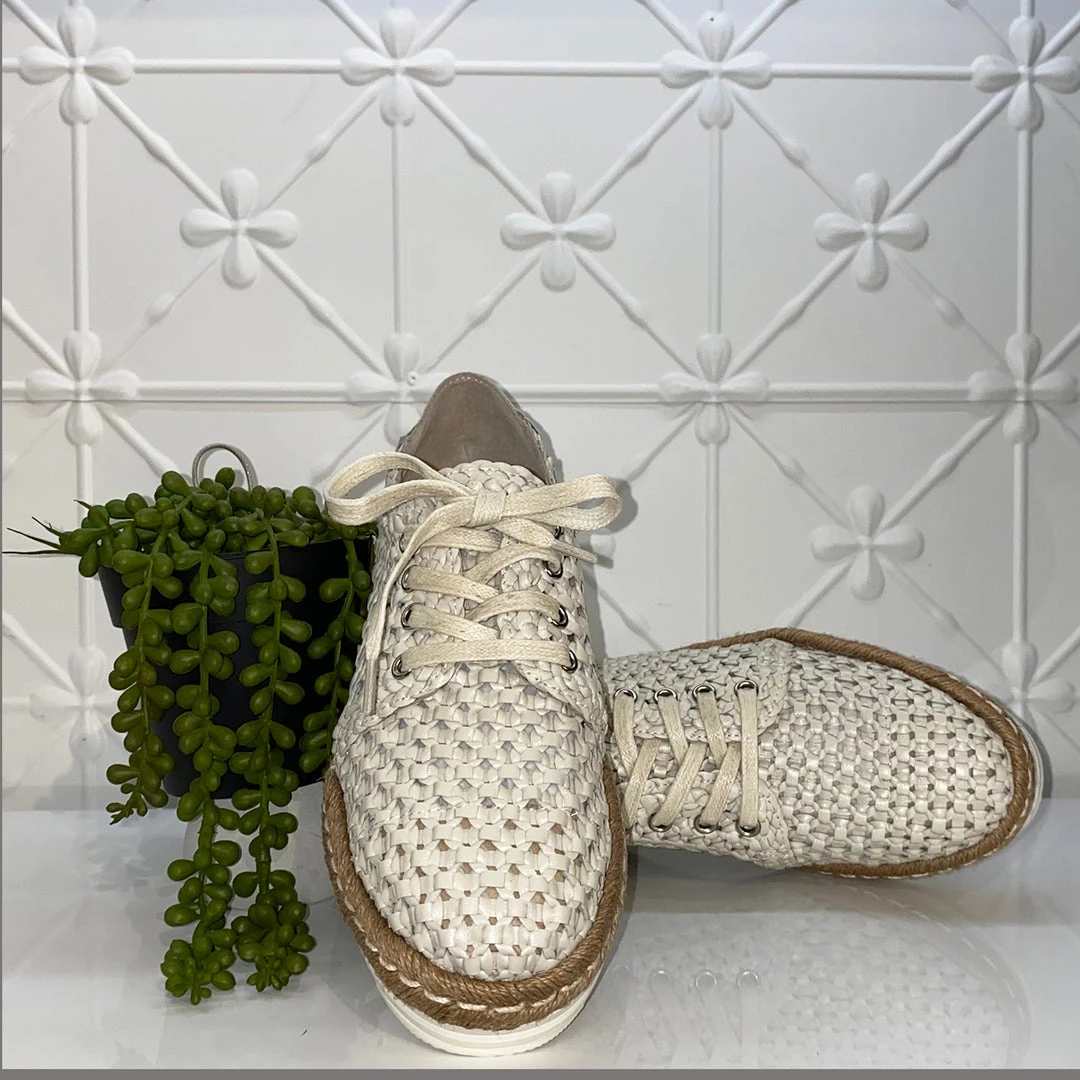 The gorgeous Woven Evert sneaker is set on a statement striped sole with rustic jute trim, The woven evert sneaker is a versatile shoe, the woven evert sneaker can be worn season in to new season with an enclosed toe and heel that makes it appropriate for work. Lace up the front, with a woven upper and braided midsole contrast to create an elegant bohemian finish.