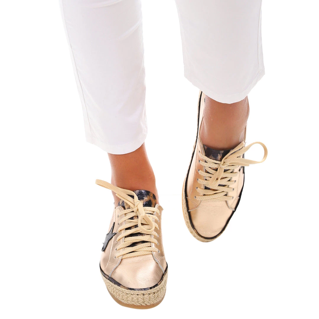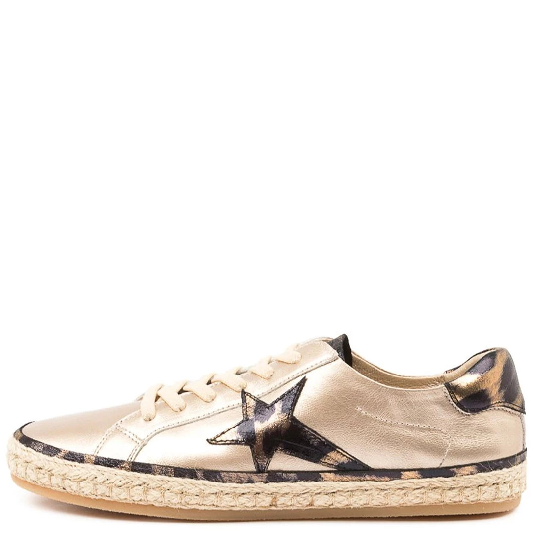 These statement sneakers by Django & Juliette are a must have piece for your all occasions wardrobe! The Kaller Sneaker in Champagne Ocelot Leather laces up and is made from a metallic champagne leather, accented with old gold ocelot trimmings. With a shimmer lace and light weight finish these Django & Juliette sneakers are what we love about adding a touch of Pizazz to your outfits!