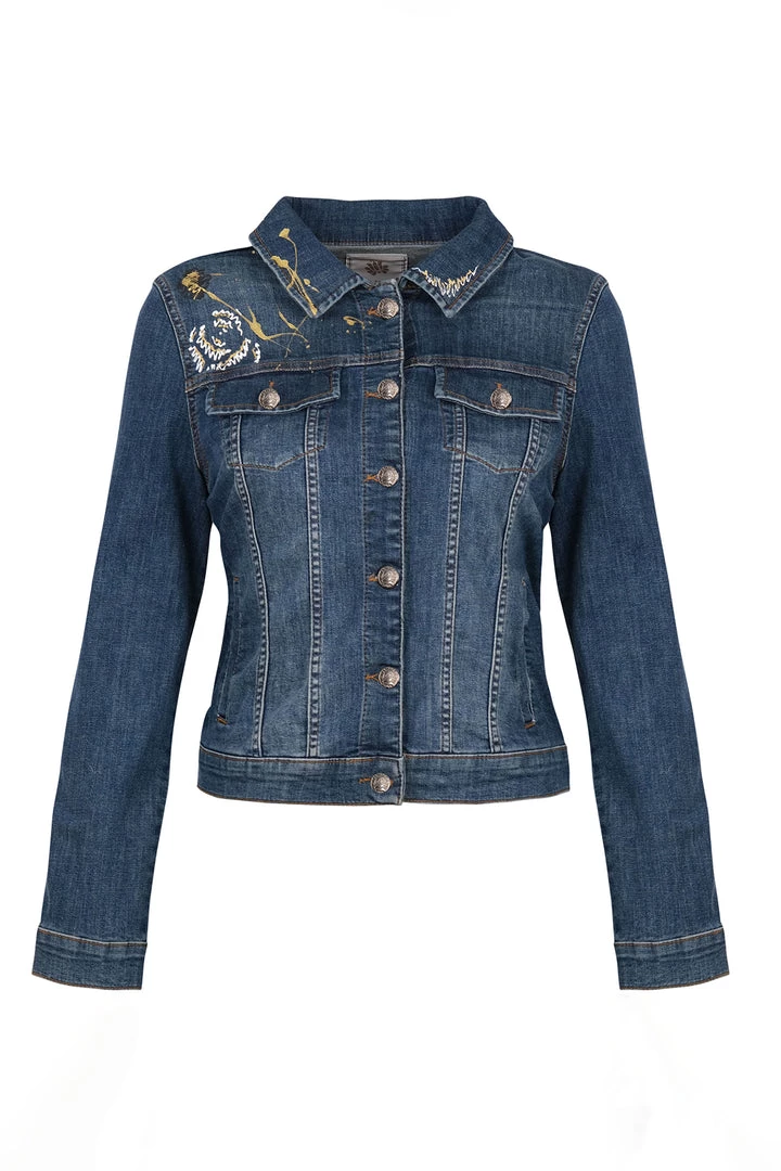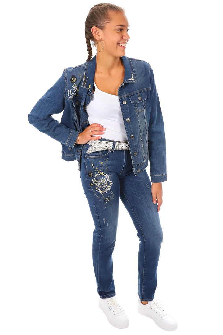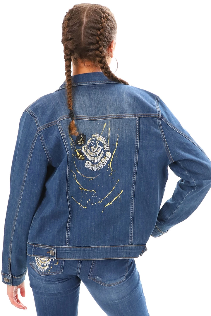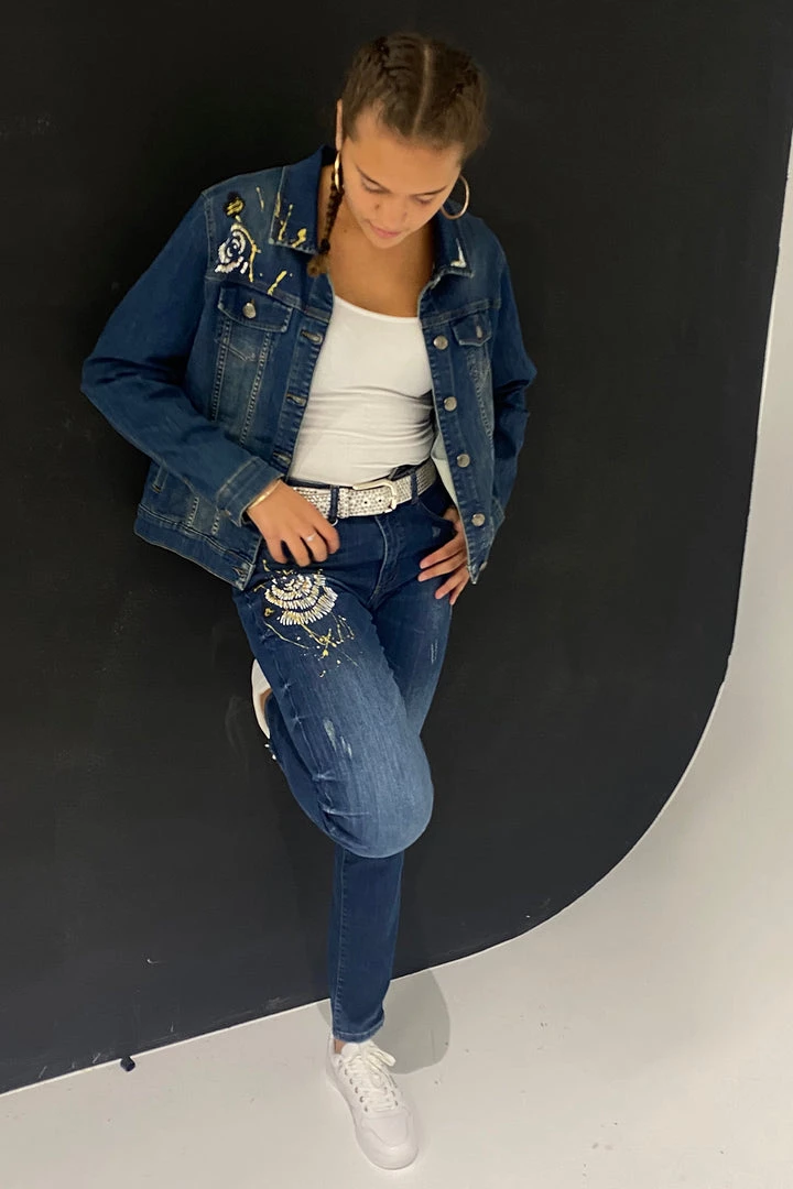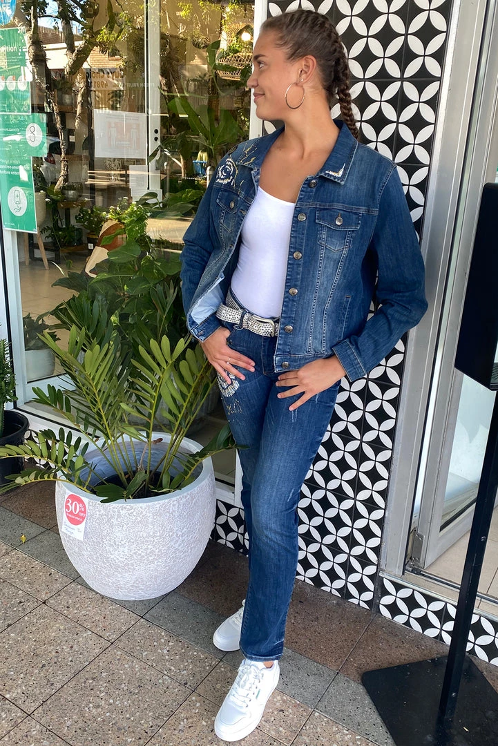Ladies we all have a denim jacket but this one is a must have to set your style a step above the rest! Dolcezza have created a metallic embroidered jacket with a motif that is also an incredible fit! This jacket also has a matching jean and the ensemble looks amazing with a metallic belt and finished with a white leather sneaker.