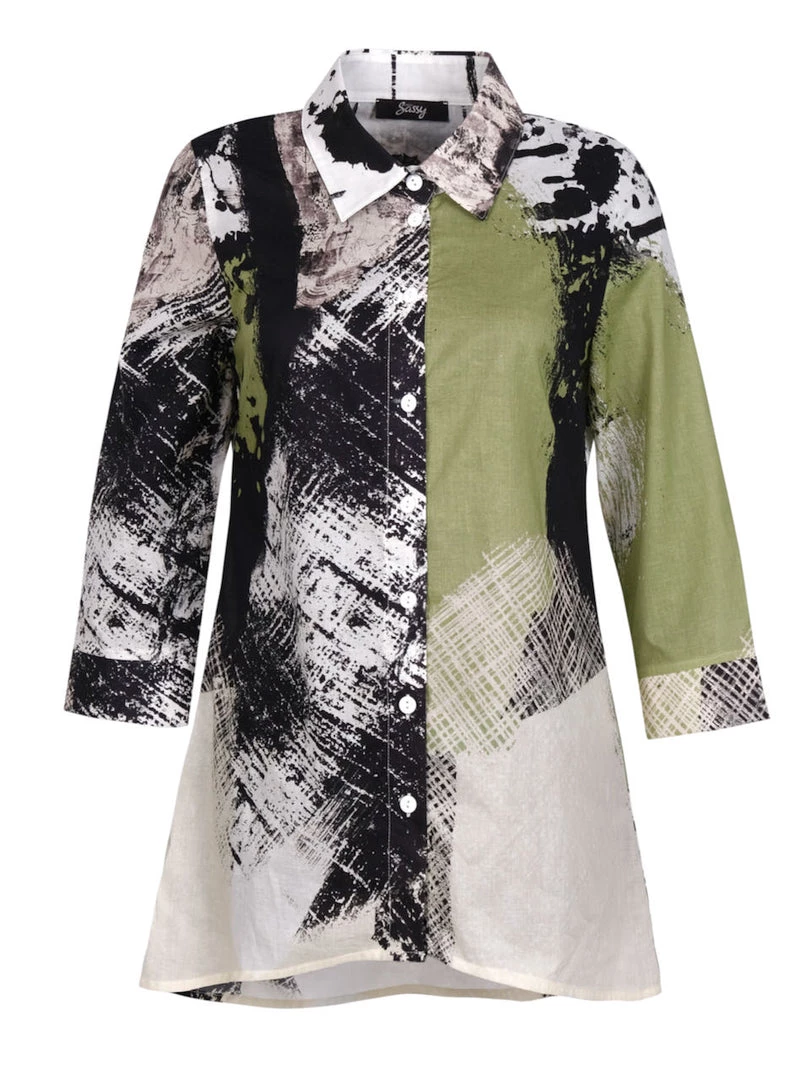 The Ever Sassy Label by Dolcezza is exactly that. Light cotton Shirt in a graphic print, with button opening. It is a 3/4 sleeve with a v collar. The hem is straight with a longer hem at back of shirt.