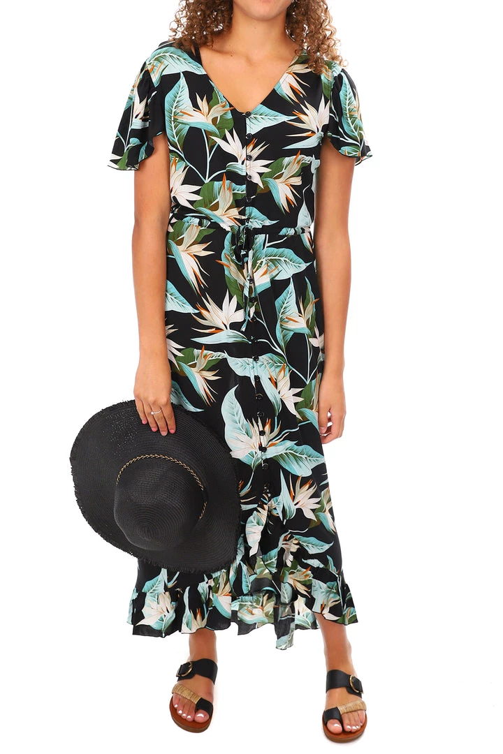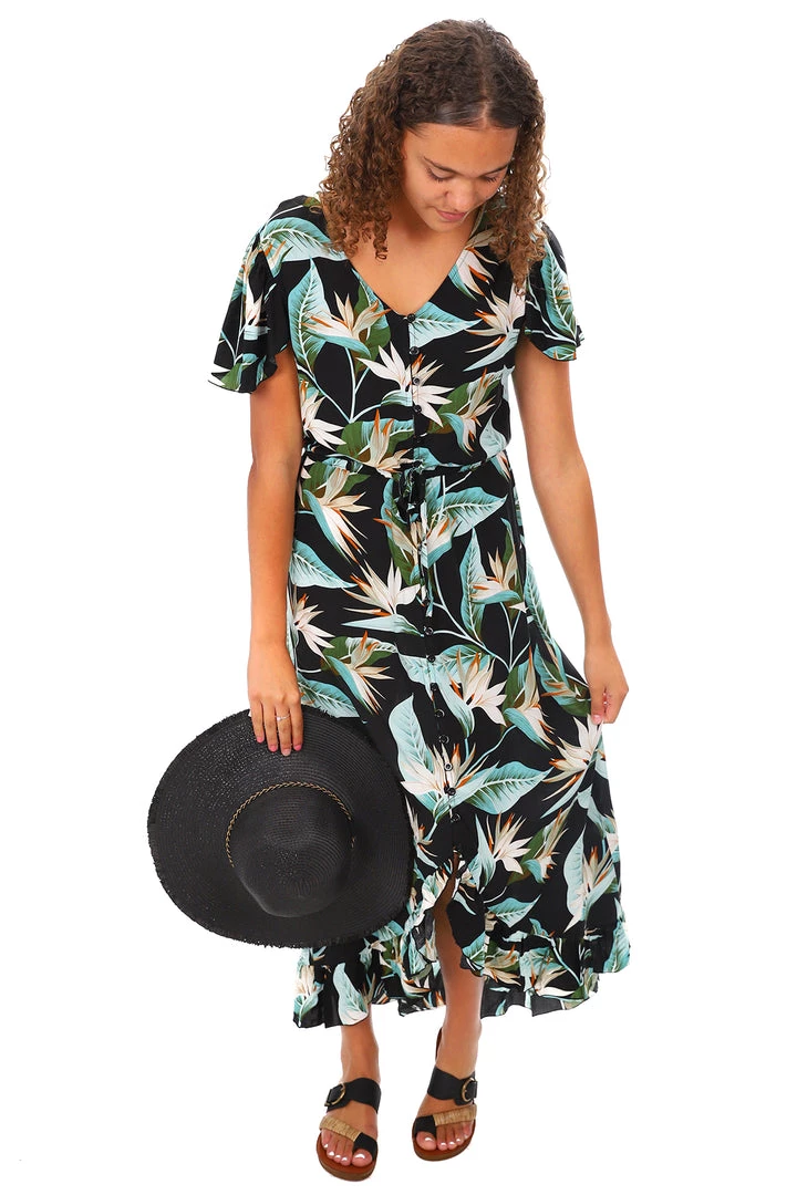 Our Isla dress buttons through with a drawstring waist and a ruffle trim. Isla is the prettiest dress and looks fabulous with heels or flats. Wear Isla every day or dress it up for a special occasion – either way when you wear Isla you will have heads turning.