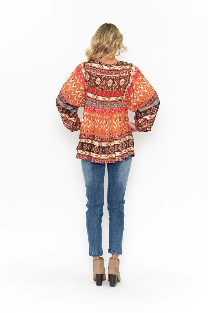 Beautiful relaxed boho style top in a fashionable print for this season, with long flare batwing sleeves, V- neckline, this boho top is a winner for all ladies, pair up with your favourite jeans or skirt, boots or a sneaker.
