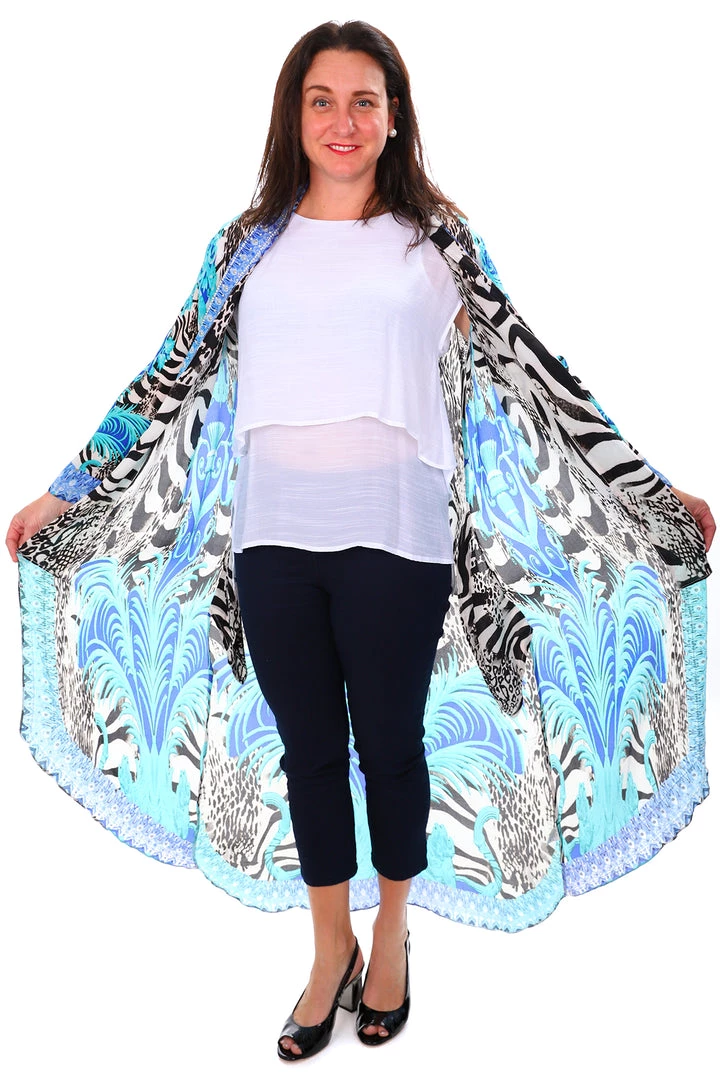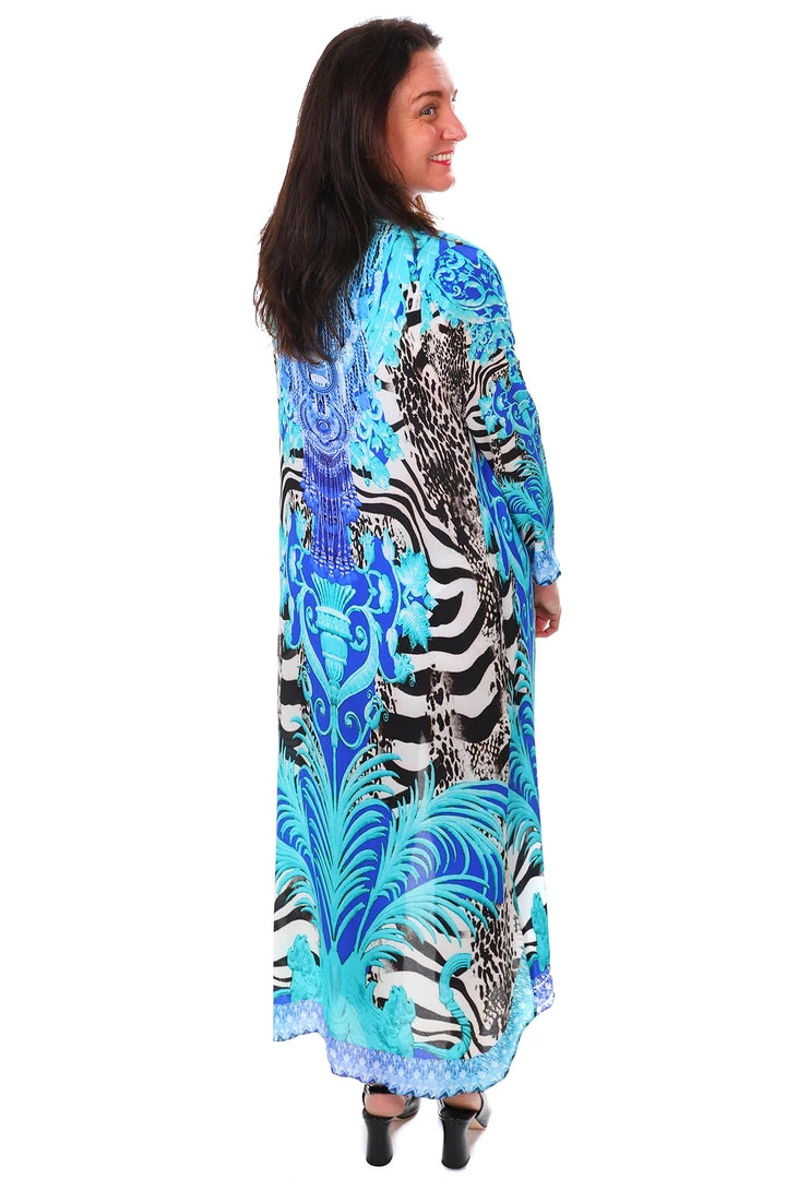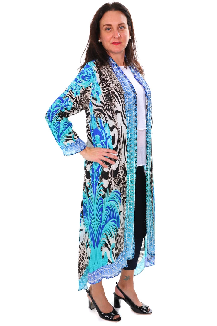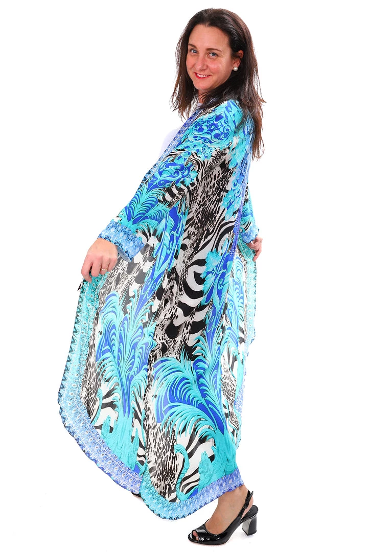 Add unparalleled glamour to your next event with this beautiful Picasso Long Silk Kaftan by Fashion Spectrum. This 100% pure silk kimono style throw brings the most wonderful shades of Blue, Grey, Aqua and Black and highlights them with beads to inspire your wardrobe.  With long sleeves, pockets and an ankle length finish this silk coat is perfect for wearing over jeans or dresses!