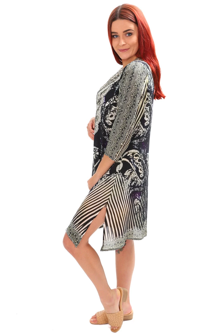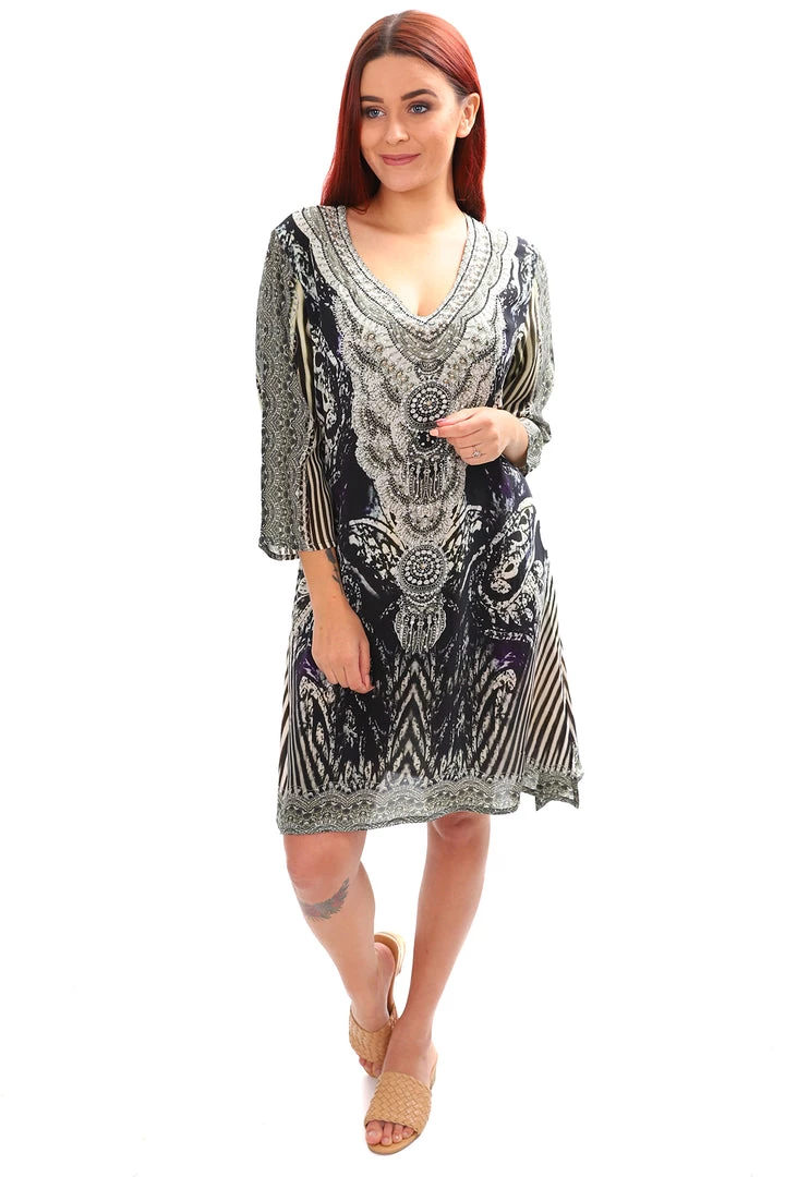 Fashion Spectrum’s tunic dress is created from natural, rich fabrics, 100% silk, luxurious embroideries and exotic beadwork are chosen from a wide spectrum of colours. Being a natural fibre it will keep you cool in summer. Perfect to match with your favourite pants, jeans or even a pencil skirt for daytime or evening wear. Ideal for cruising!
