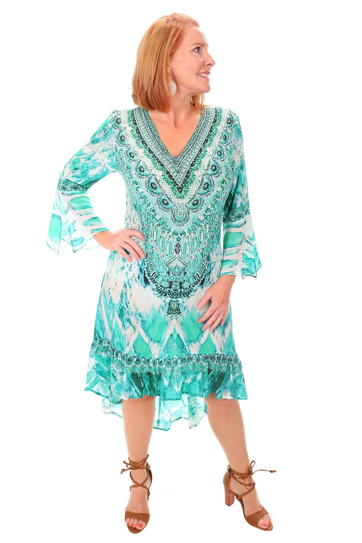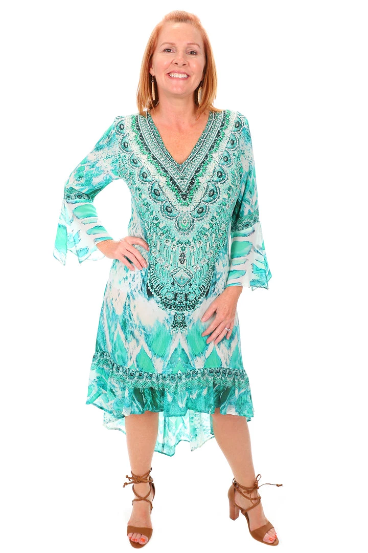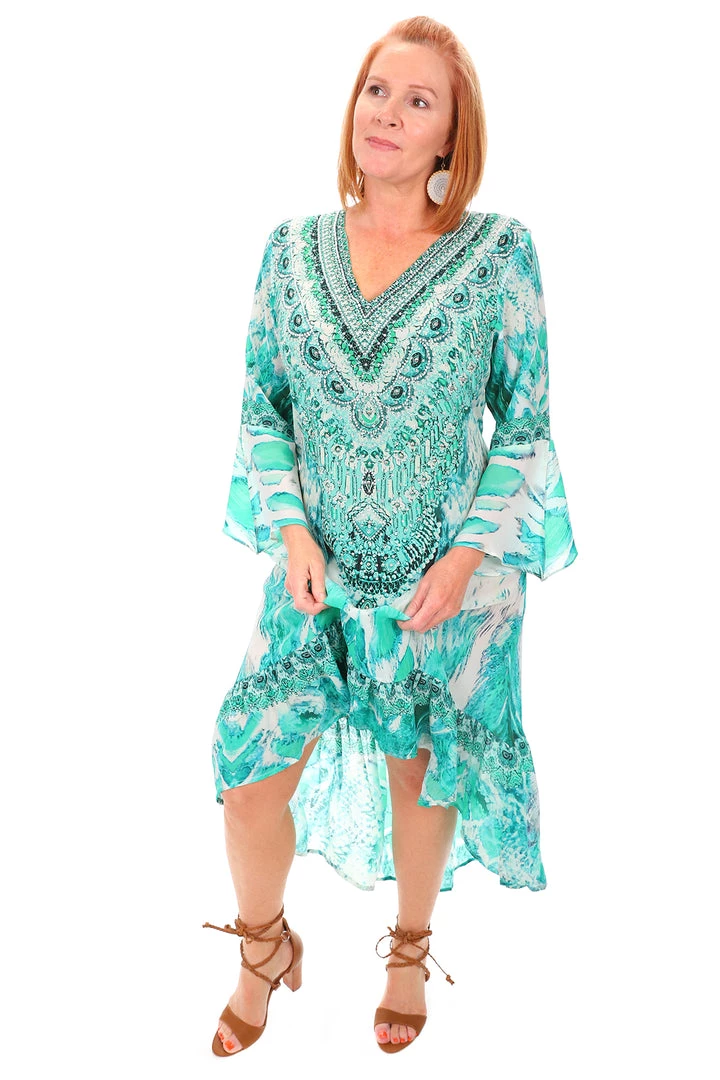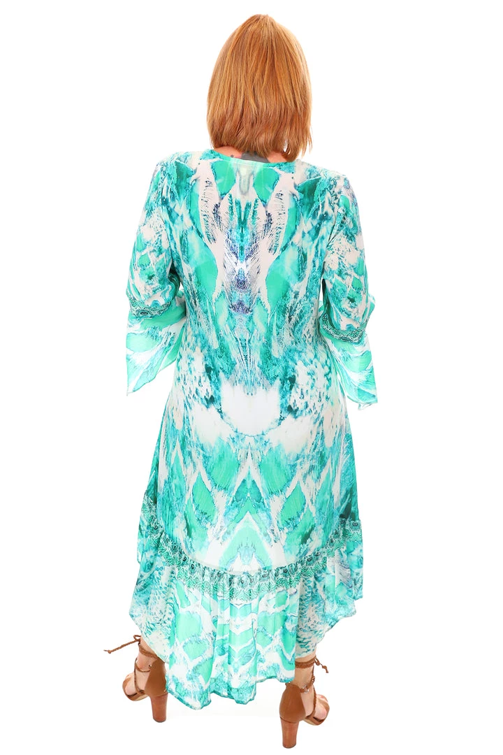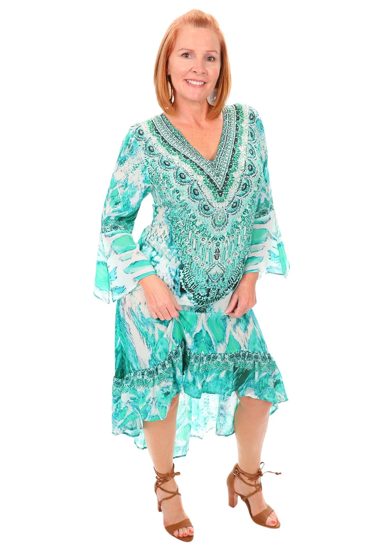 Illuminate your style with this breathtaking Paluma High Low Silk Dress in green by Fashion Spectrum. Made from premium silk this life changing dress uses greens and whites to inspire patterns between boho and modern. The V neckline and frilled hem create a femininity that you can’t pass up! Perfect for everything from weddings to picnics!