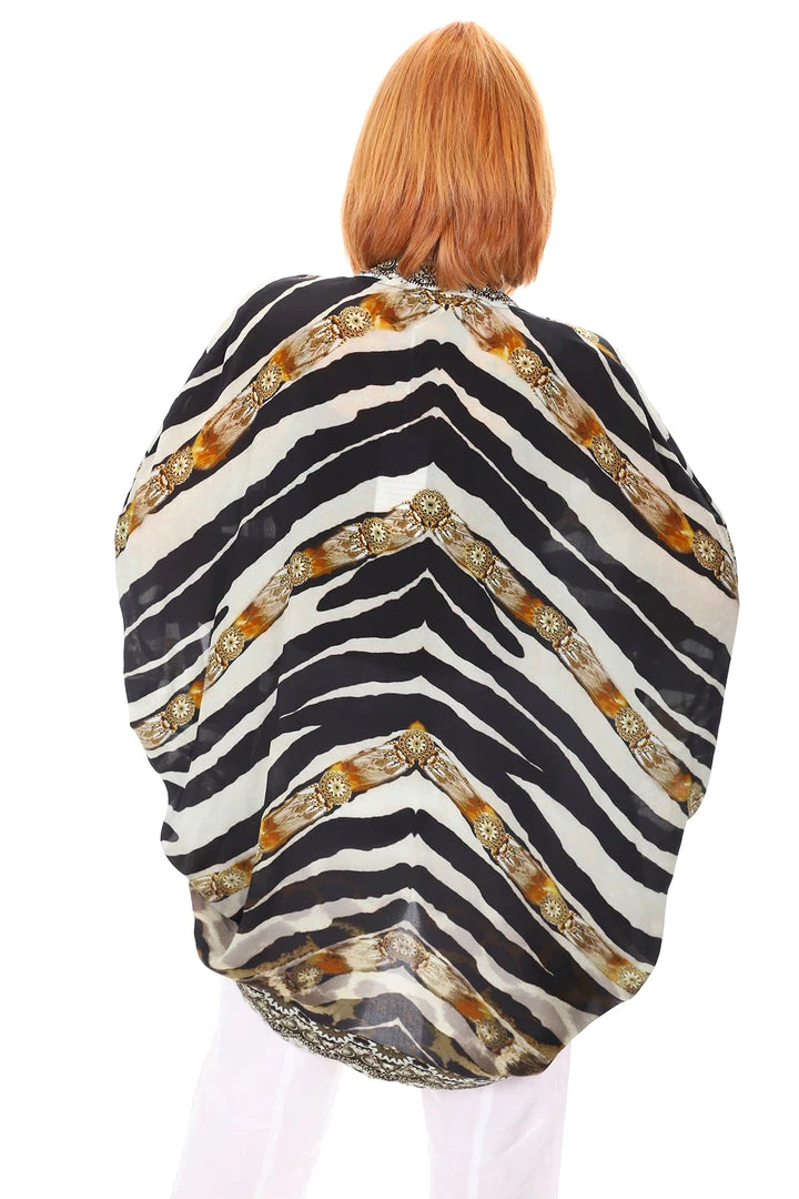 Silk; sweet, striking and absolutely divine! This fashion spectrum cape is the ultimate layering piece crafted from exotic fabric and beads!