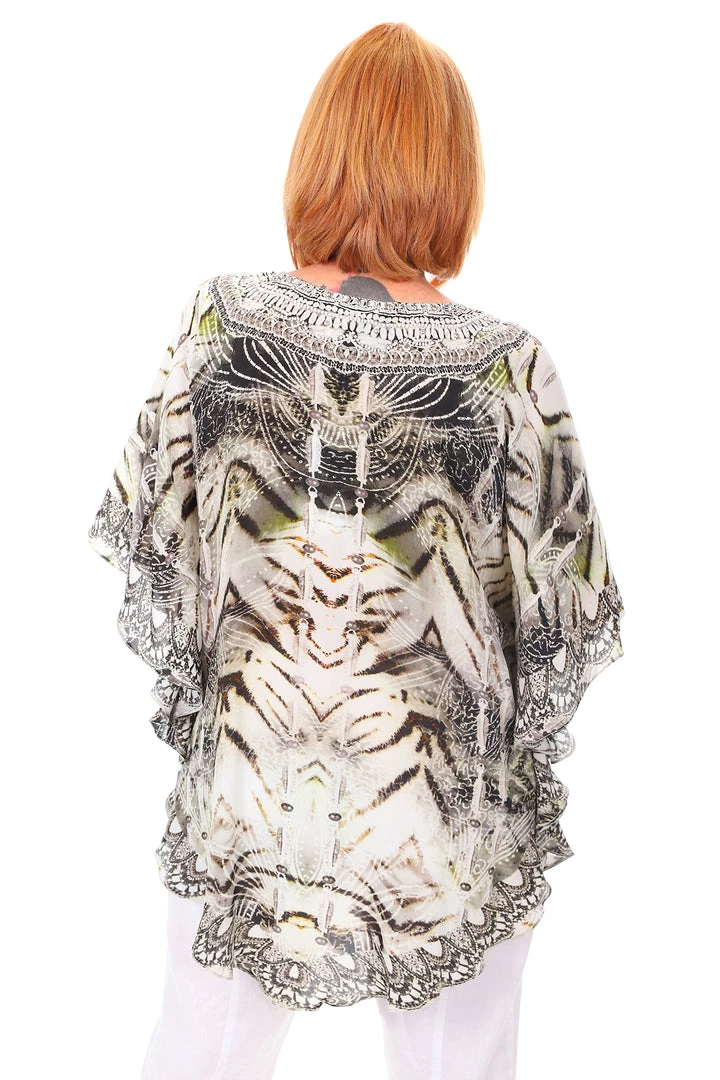 Float like a butterfly with wings of vibrant rainbow in this Tahiti Butterfly Kaftan by Fashion Spectrum. With luscious floaty sleeves that drape with elegance and follow the hemline down to a soft peak this 100% pure silk top is glamorous and versatile. Highlighted with white beading this beautiful Fashion Spectrum silk kaftan is ideal for everything from weddings to cruising!
